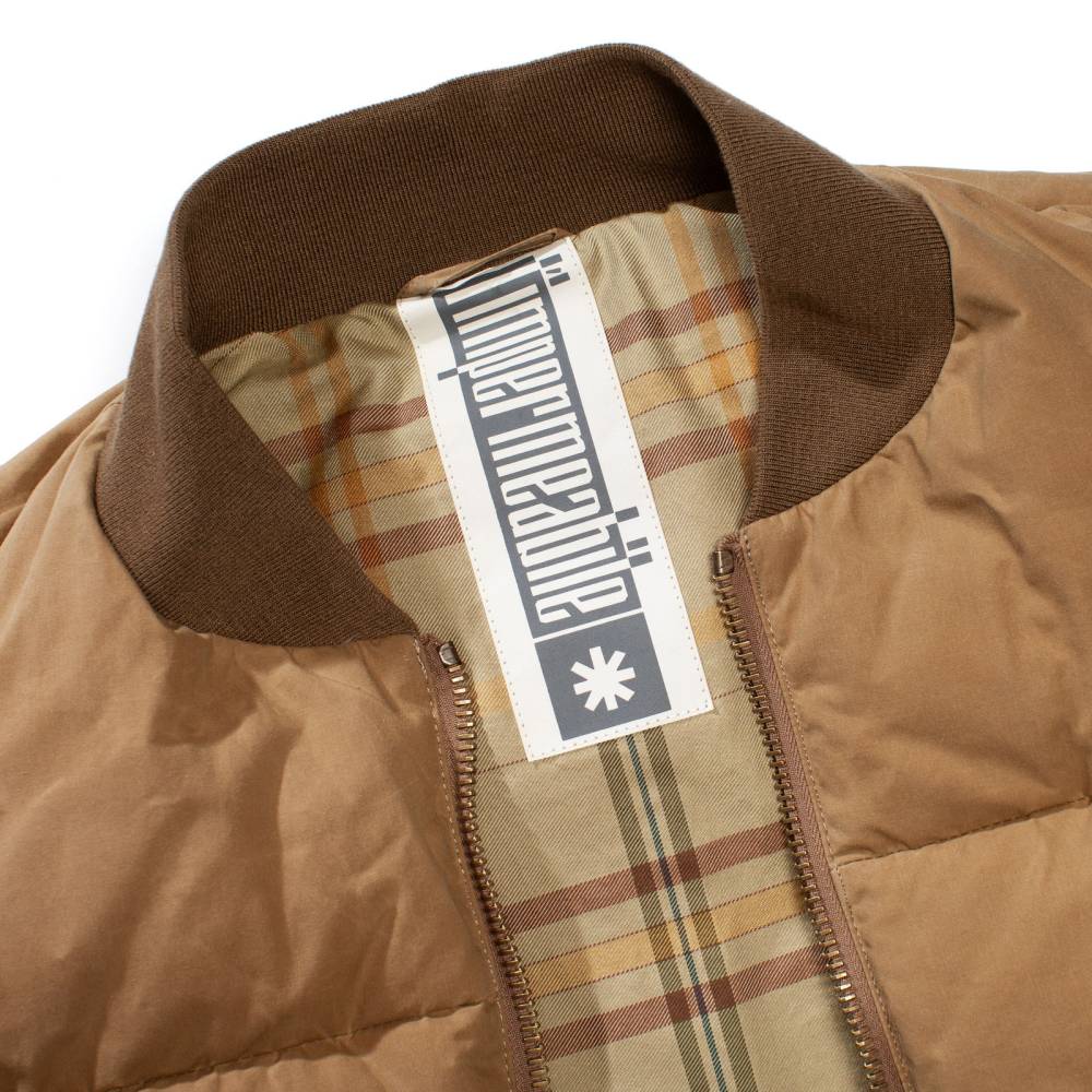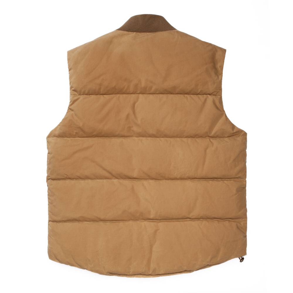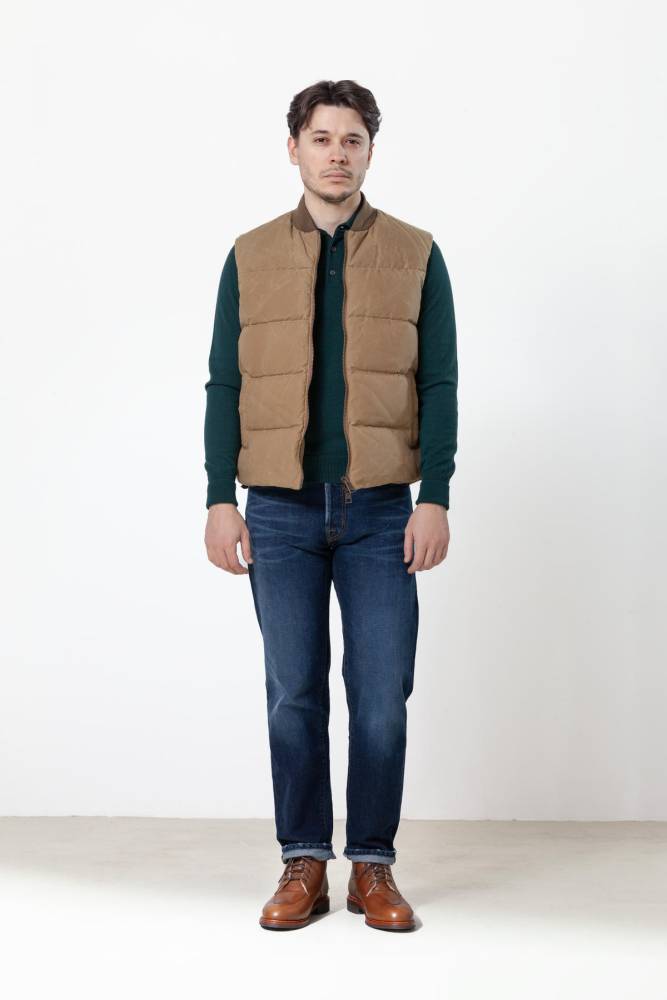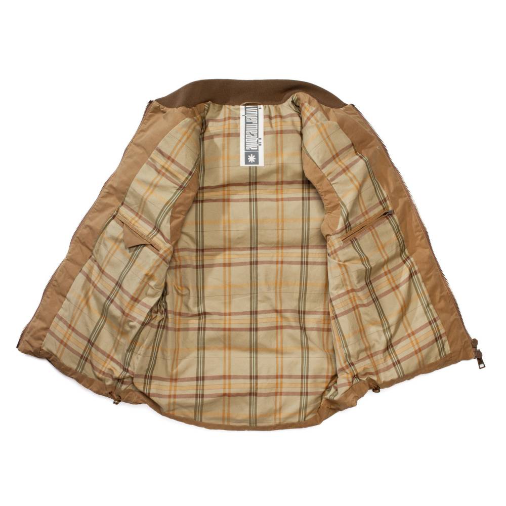 Объёмный тёплый мужской жилет Joan итальянского бренда L`Impermeabile. С внешней стороны модель выполнена из водоотталкивающей хлопковой ткани бежевого цвета, пропитанной воском. Подкладка с фирменным клетчатым принтом из тонкой ткани, в состав которой входят хлопок и полиэстер. Наполнитель: натуральный пух. Модель имеет два внешних кармана на кнопках и два внутренних кармана (на молнии и на пуговице). Низ жилета затягивается при помощи двух кулисок по бокам. Жилет прекрасно дополнит повседневный образ. Его можно удачно сочетать с джинсами, тёплыми свитерами из флиса и фланелевыми рубашками.