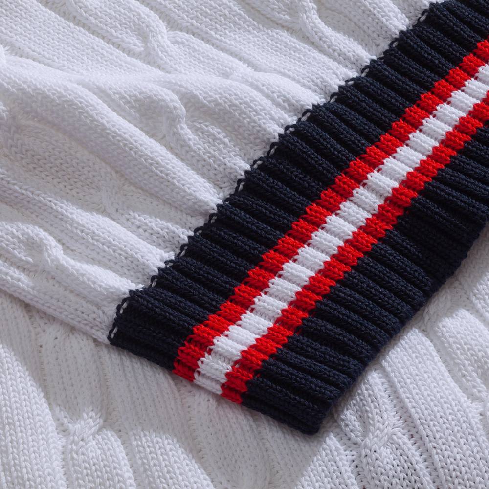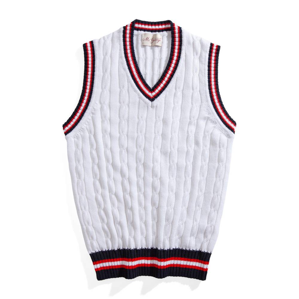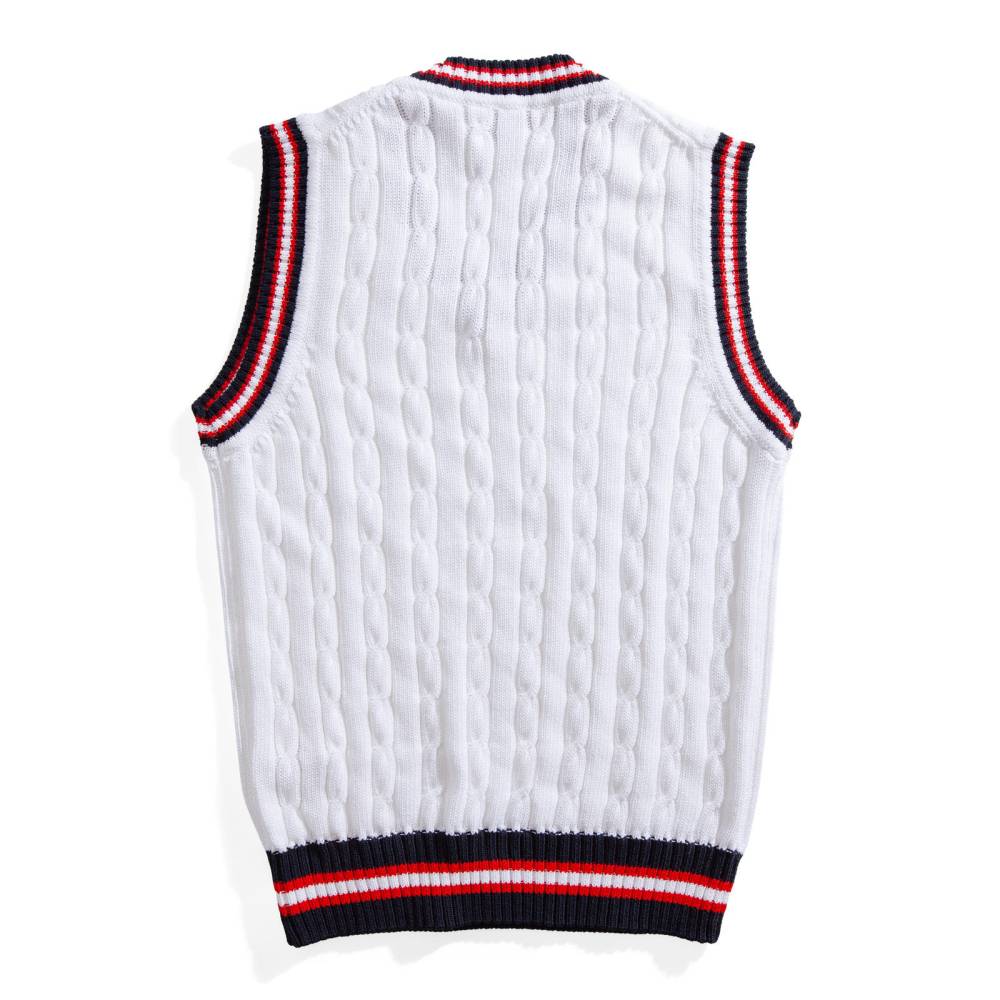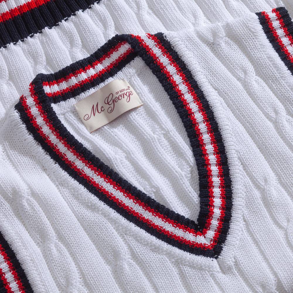 Классический жилет для крикета Newtonmill бренда McGeorge of Scotland белого цвета с традиционным V-образным вырезом и контрастными краями. Выполнен из мягкого перуанского хлопка Pima, который отличается тонкими и длинными волокнами: изделия из такого хлопка приятны к телу и долговечны. Фактурная кабельная вязка. Жилет прекрасно сочетается с casual-образами в тёплую погоду.