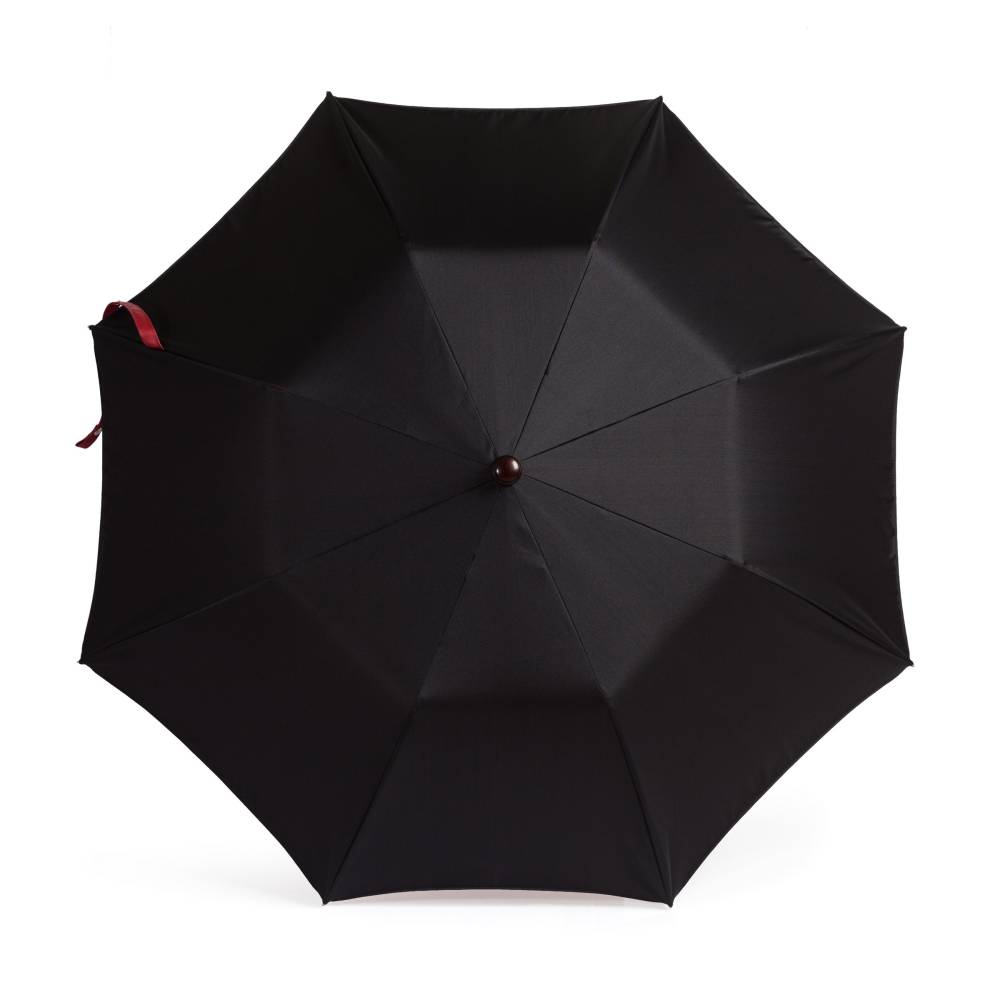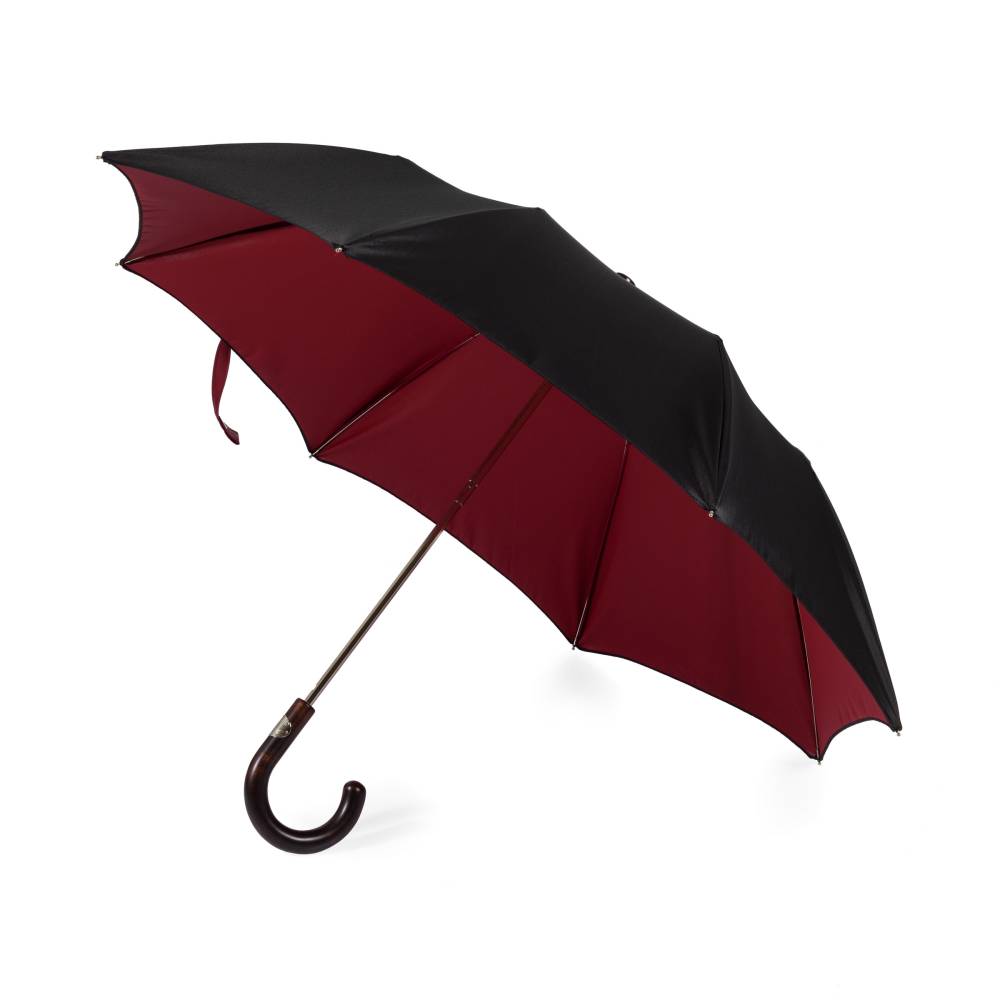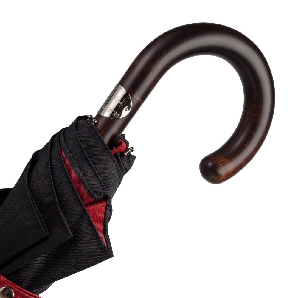 Складной механический зонт Maglia Francesco с куполом из плотного полиэстера. Внешняя сторона купола – тёмно-синего цвета, а внутренняя имеет благородный красный оттенок. Металлический каркас. Стержень выполнен из полированной стали, а ручка – из древесины клёна. Место соединения стержня и ручки укреплено металлическим кольцом. Ручка украшена шильдом с выгравированным логотипом компании.