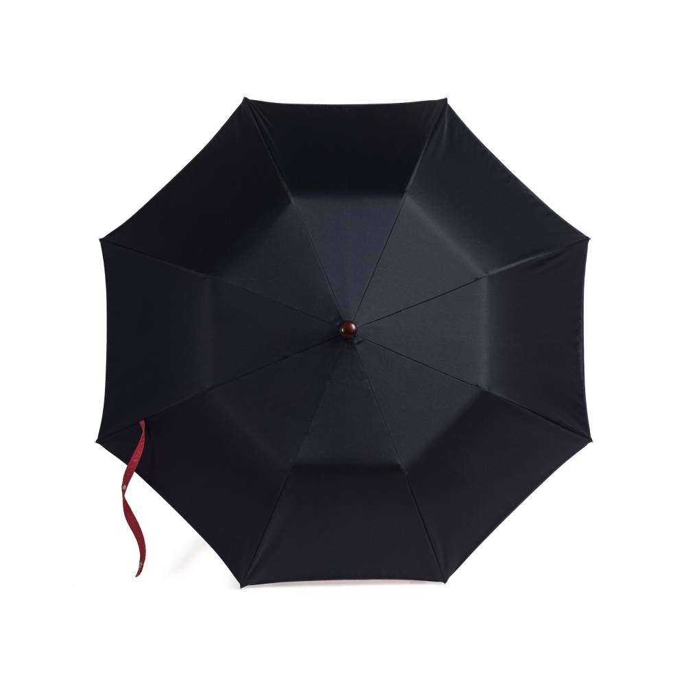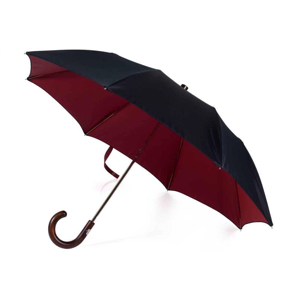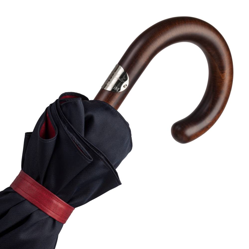 Складной механический зонт Maglia Francesco с куполом из плотного полиэстера. Внешняя сторона купола – тёмно-синего цвета, а внутренняя имеет благородный красный оттенок. Металлический каркас. Стержень выполнен из полированной стали, а ручка – из древесины клёна. Место соединения стержня и ручки укреплено металлическим кольцом. Ручка украшена шильдом с выгравированным логотипом компании.