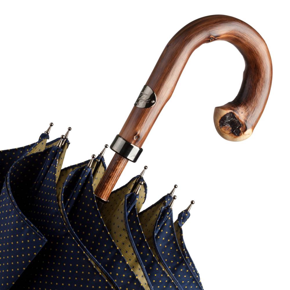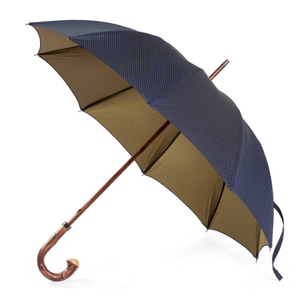 Классический мужской зонт-трость Maglia Francesco с объёмным куполом из плотного полиэстера тёмно-синего цвета снаружи и горчичного внутри. Ткань украшена мелким узором «горошек» жёлтого цвета. Стержень выполнен из клёна, а рукоять – из корня орехового дерева. По заказу бутика Checkroom модель дополнена элементами из чёрного полированного металла: наконечником, защищающим стержень от сколов и шильдом c выгравированным логотипом компании. К зонту прилагается текстильный хлопковый кофр для хранения.