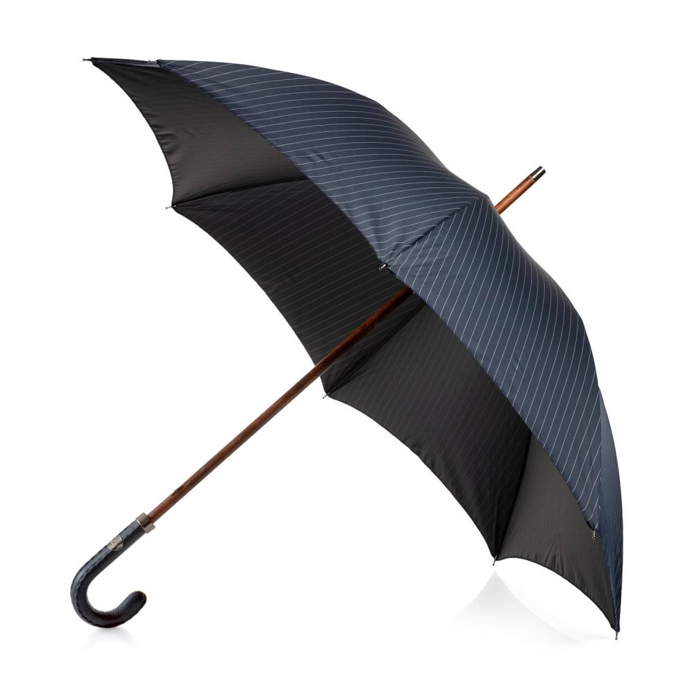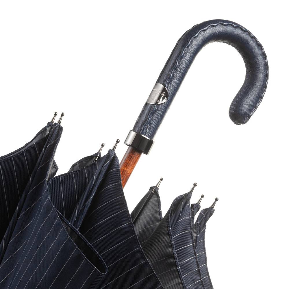 Классический мужской зонт-трость Maglia Francesco с объёмным куполом из гладкого полиэстера тёмно-синего цвета в серую полоску. Стержень и рукоять выполнены из клёна. По заказу бутика Checkroom модель дополнена элементами из полированного металла: наконечником, защищающим стержень от сколов и шильдом c выгравированным логотипом компании. К зонту прилагается текстильный хлопковый кофр для хранения.