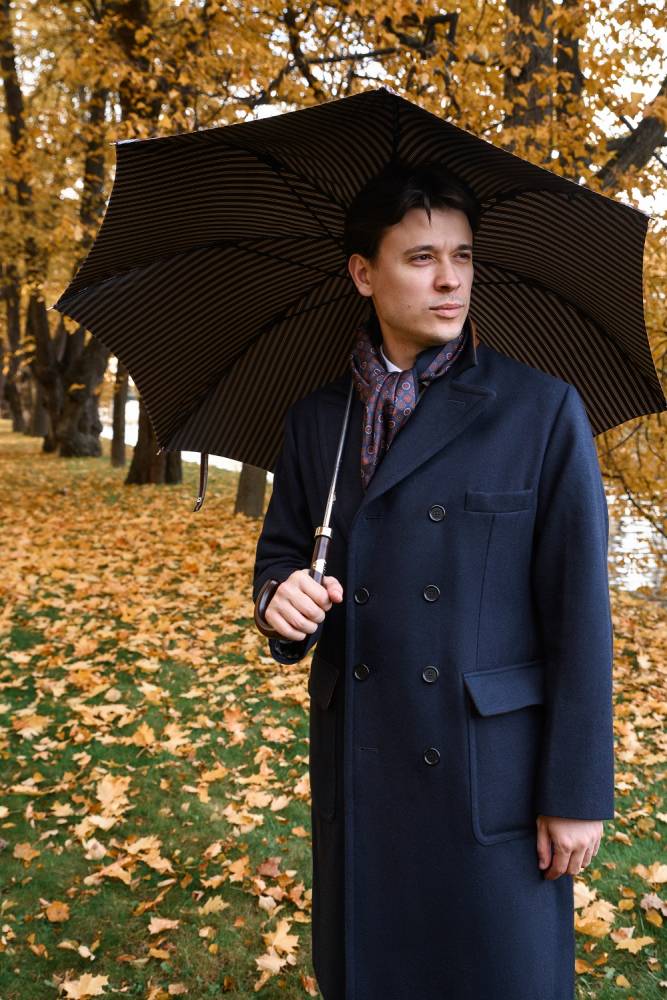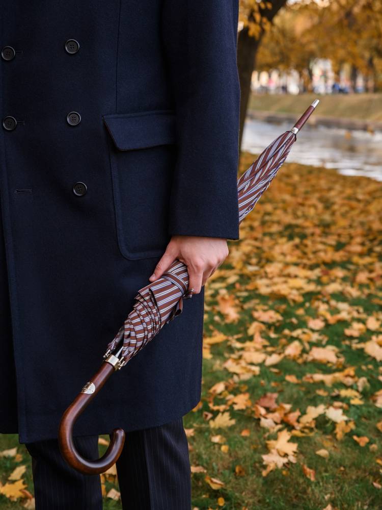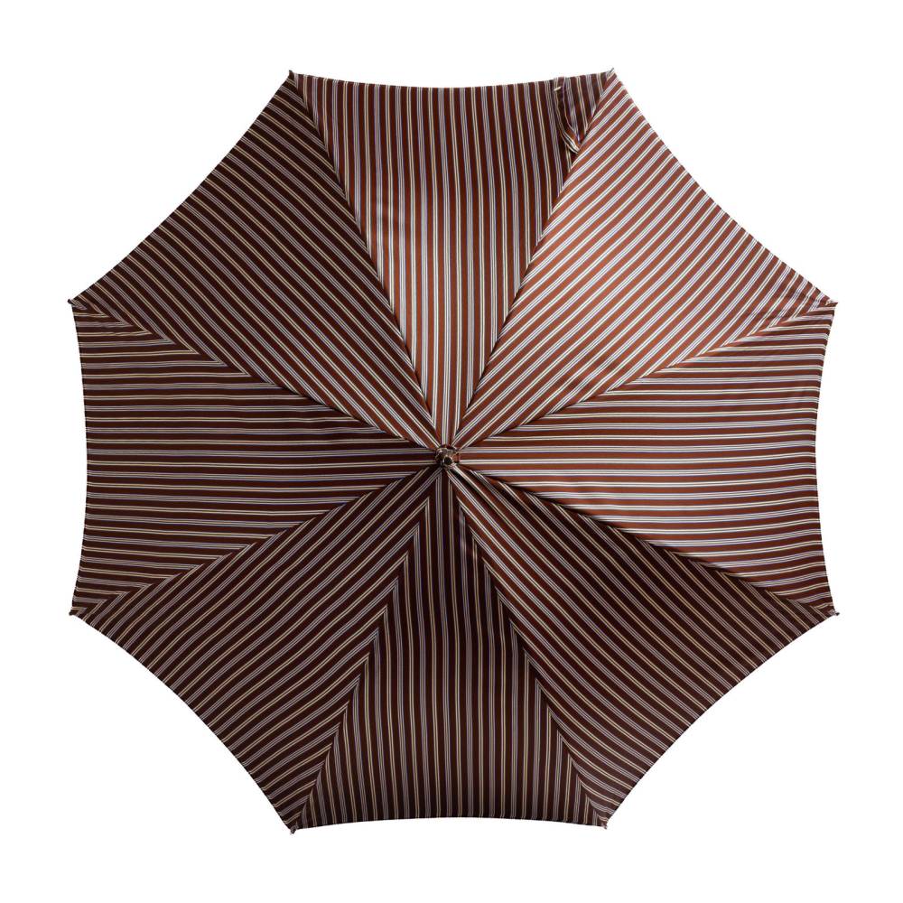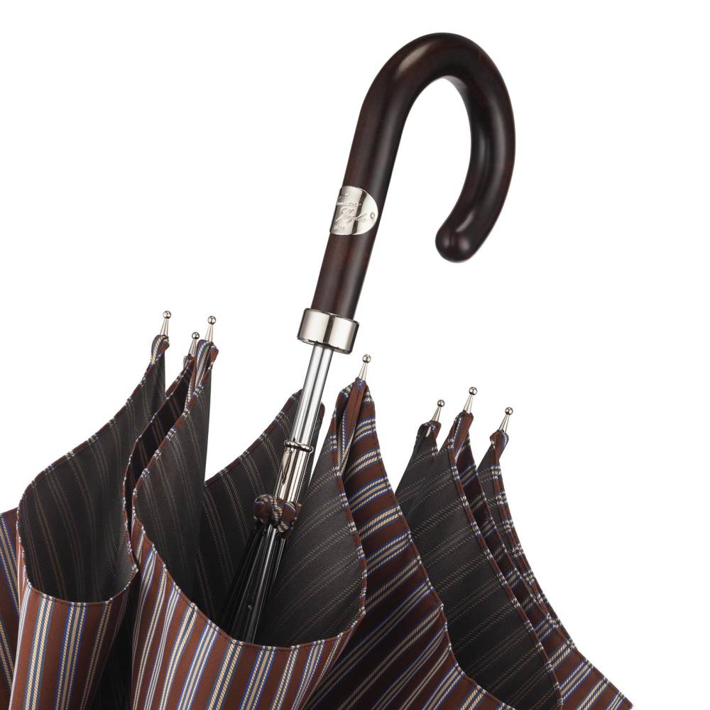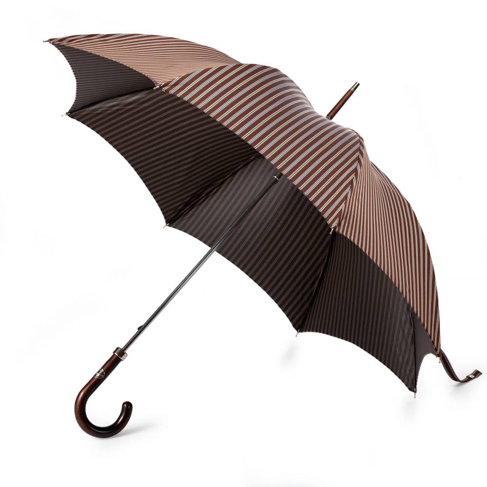 Элегантный зонт-трость Maglia Francesco со стержнем из прочного полированного металла. Подойдёт как для мужчин, так и для женщин. Купол выполнен из плотного полиэстера коричневого цвета со свелыми поласами. Металлический каркас. Приятная на ощупь рукоять выполнена из тёмной древесины клёна. Металлический наконечник в верхней деревянной части зонта защищает от сколов при соприкосновении с асфальтом. Рукоять украшена шильдом с выгравированным логотипом бренда.