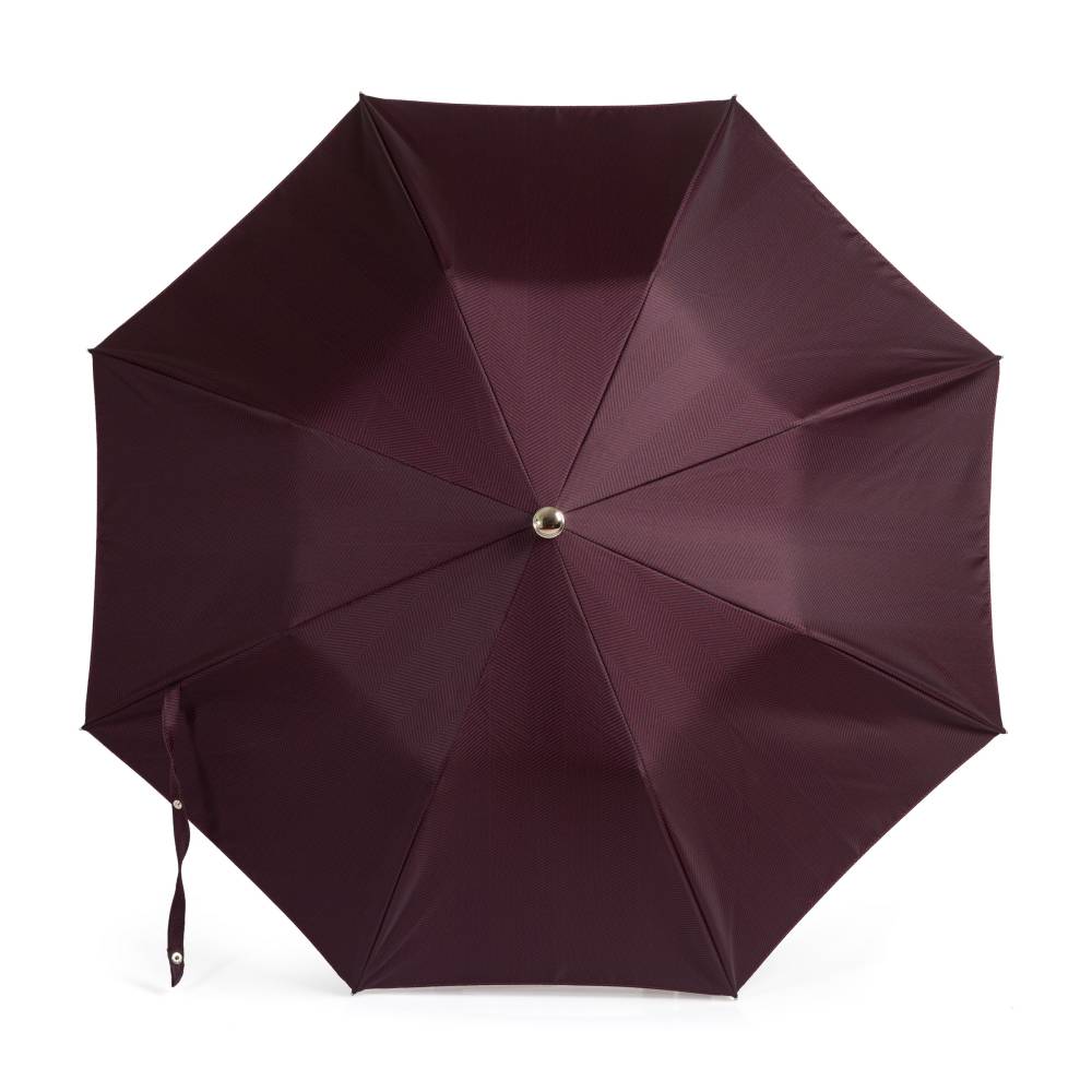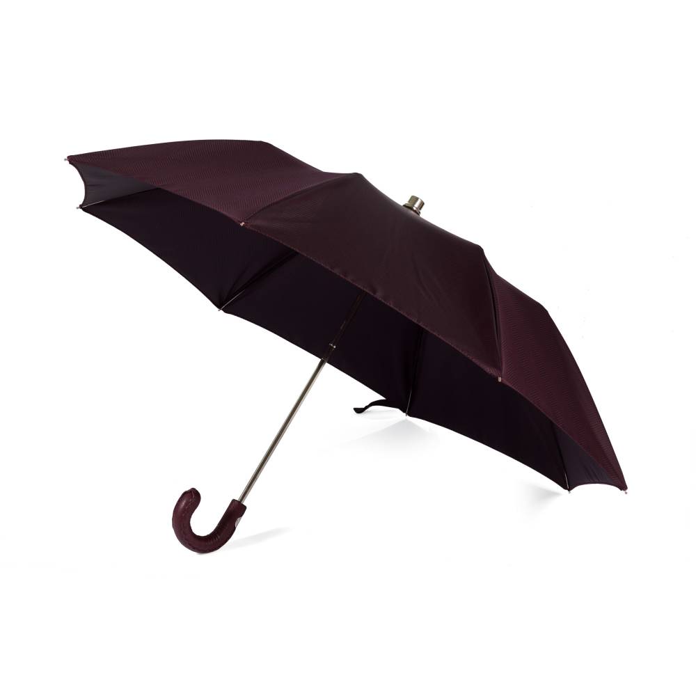 Складной механический зонт Maglia Francesco с куполом из плотного полиэстера бордового цвета с фактурным узором. Металлический каркас. Стержень выполнен из полированной стали, а ручка – из пластика, обтянутого натуральной кожей с тиснением. Место соединения стержня и ручки укреплено металлическим кольцом. Ручка украшена шильдом с выгравированным логотипом компании.