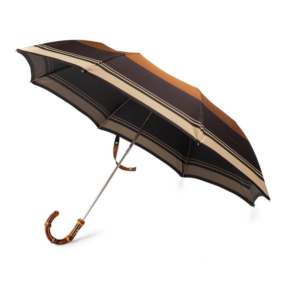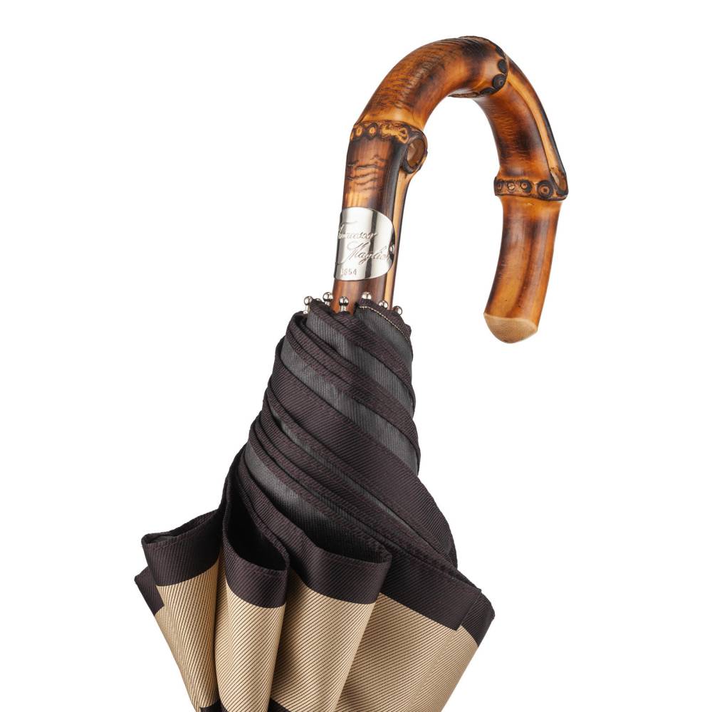 Компактный складной зонт Maglia Francesco с куполом из плотного полиэстера в кофейно-кремовой цветовой гамме. Металлический каркас. Стержень выполнен из лёгкого полированной металла, а ручка – из бамбука. Ручка украшена шильдом с выгравированным логотипом бренда. К зонту прилагается чехол из той же ткани, что и купол. Модель подойдё как для мужчин, так и для женщин.