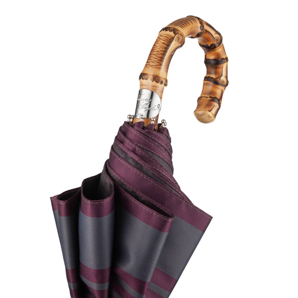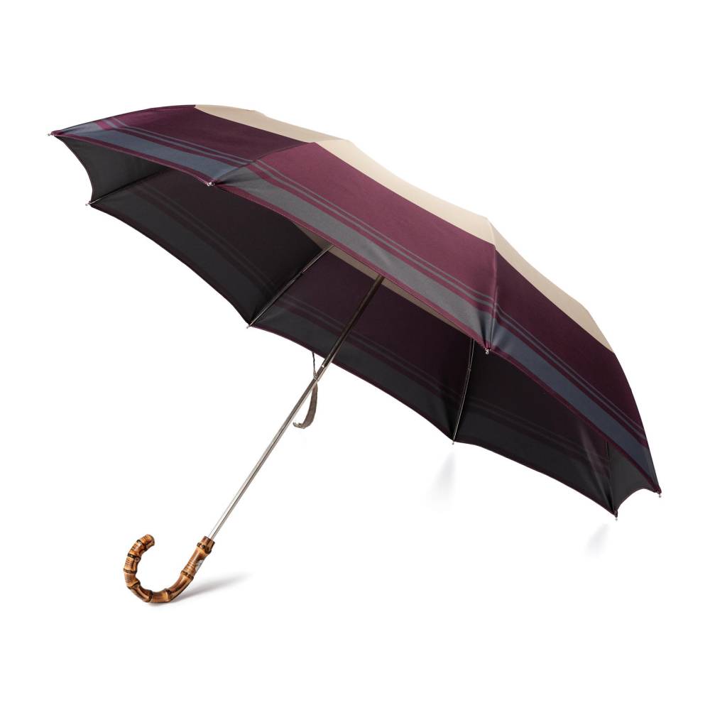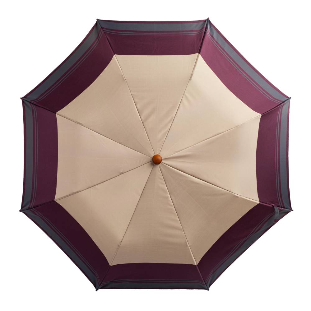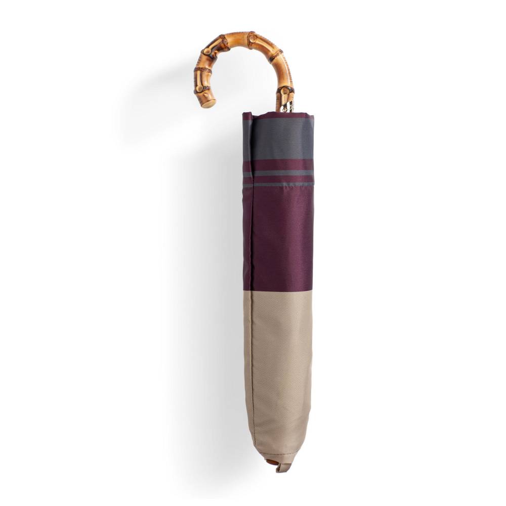 Компактный складной зонт Maglia Francesco с куполом из плотного полиэстера в бежево-бордовой цветовой гамме. Металлический каркас. Стержень выполнен из лёгкого полированной металла, а ручка – из бамбука. Ручка украшена шильдом с выгравированным логотипом бренда. К зонту прилагается чехол из той же ткани, что и купол. Модель подойдё как для мужчин, так и для женщин.
