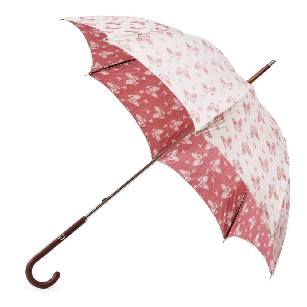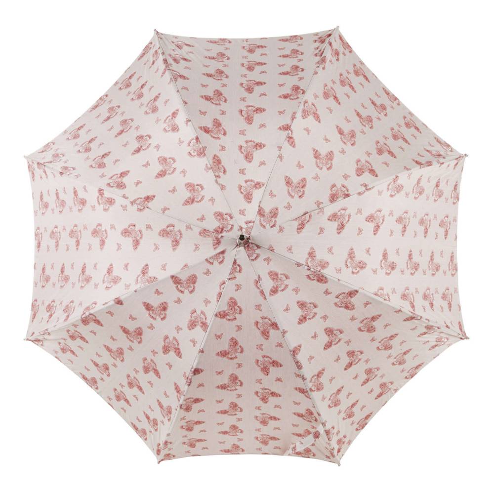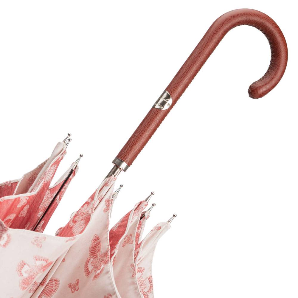 Великолепный женский зонт-трость Maglia Francesco с куполом нежно-розового цвета с принтами в виде бабочек. Металлический каркас. Стержень выполнен из полированной стали, а ручка – из пластика, обтянутого натуральной кожей тёмно-коричневого цвета с тиснением. Верхняя часть стержня над куполом выполнена из дерева и дополнена металлическим наконечником для защиты от сколов при соприкосновении с асфальтом. Ручка украшена металлическим шильдом с выгравированным логотипом компании. К зонту прилагаются текстильный кофр для хранения.