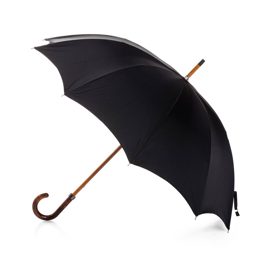 Классический мужской зонт-трость Maglia Francesco с объёмным куполом из чёрного полиэстера на металлическом каркасе. Стержень и ручка выполнены из древесины клёна, покрытой лаком. Модель дополнена наконечником из прочного чёрного пластика, защищающего стержень от сколов при соприкосновении с асфальтом. Ручка украшена металлическим шильдом с выгравированным логотипом компании. К зонту прилагаются чехол из материала купола, а также текстильный кофр для хранения.