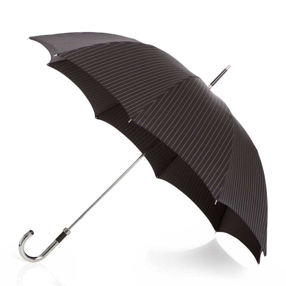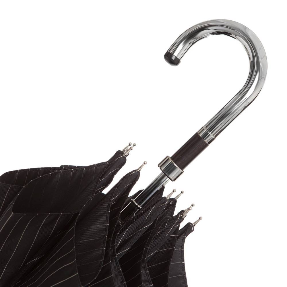 Классический мужской зонт-трость Maglia Francesco с объёмным куполом из чёрного полиэстера в белую полоску на металлическом каркасе. Стержень и ручка выполнены из полированного металла. Ручка украшена вставками из эбеновой древесины. К зонту прилагается текстильный кофр для хранения.