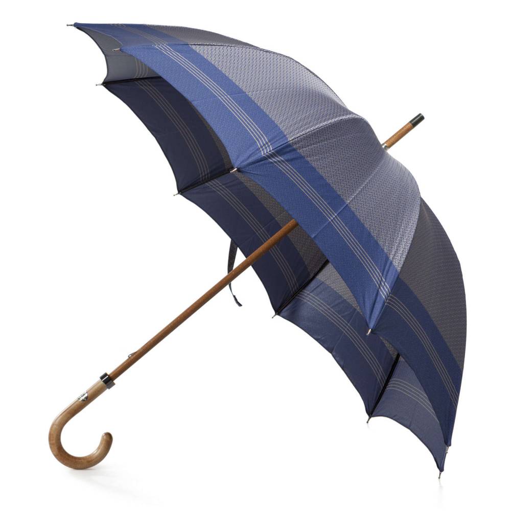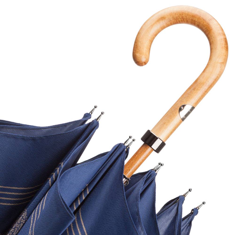 Классический мужской зонт-трость Maglia Francesco с объёмным куполом из синего полиэстера с серым рисунком на металлическом каркасе. Стержень и ручка выполнены из древесины клёна с матовой поверхностью. Модель дополнена наконечником из прочного чёрного пластика, защищающего стержень от сколов при соприкосновении с асфальтом. Ручка украшена металлическим шильдом с выгравированным логотипом компании. К зонту прилагается текстильный кофр для хранения.
