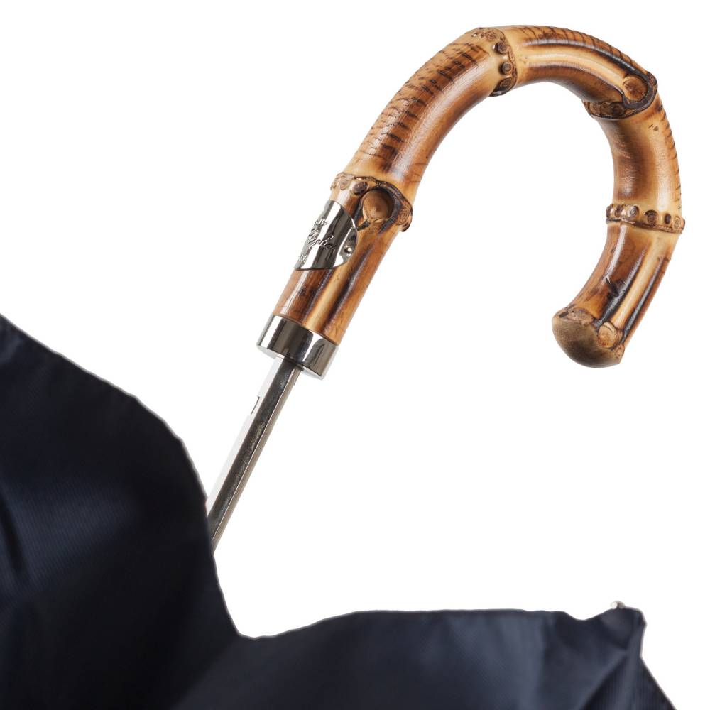 Мужской складной зонт полуавтомат Maglia Francesco с куполом из плотного полиэстера тёмно-синего цвета. Металлический каркас. Стержень выполнен из полированной стали, а ручка – из бамбука. Металлическое кольцо укрепляет место соединения стержня и ручки. Ручка украшена шильдом с выгравированным логотипом компании.