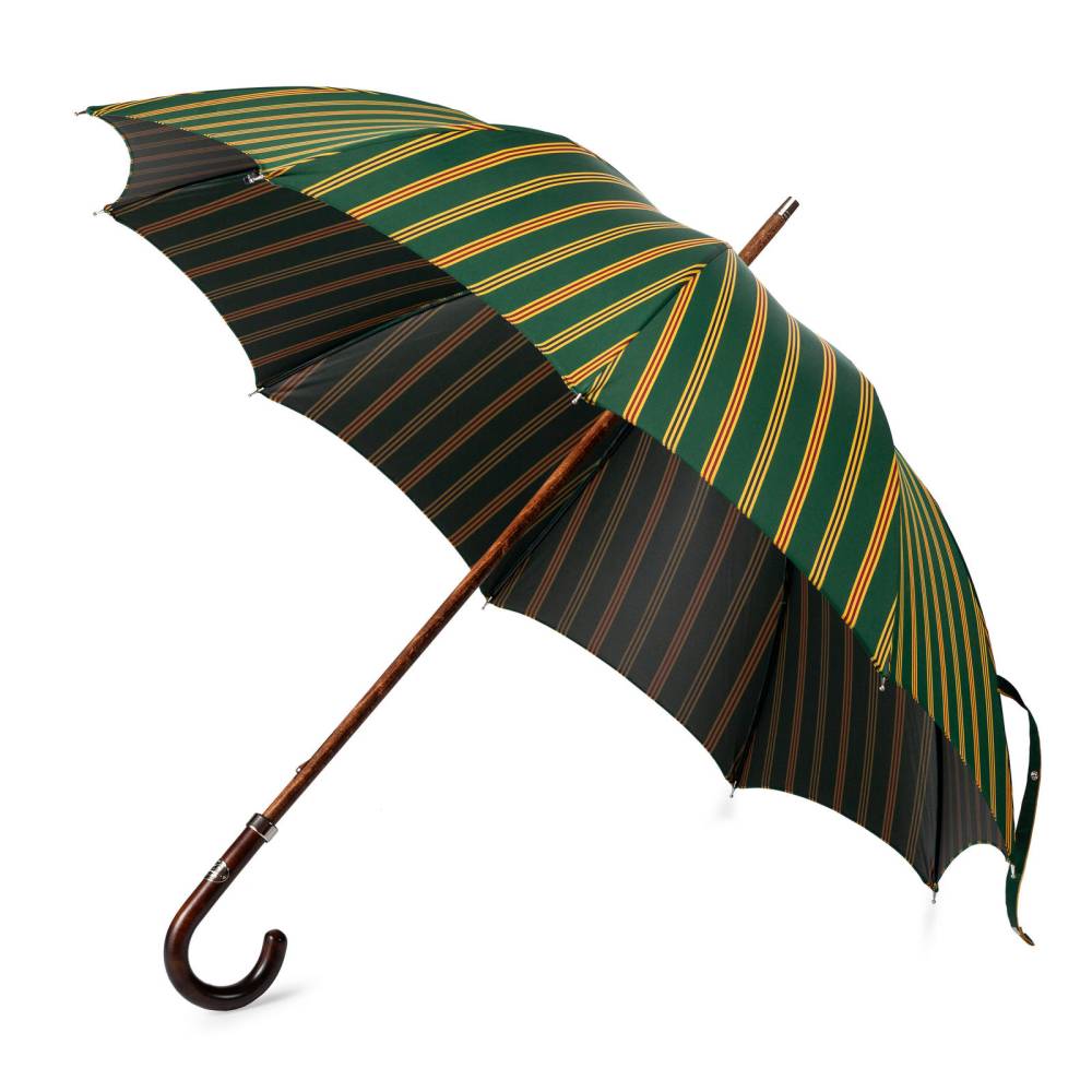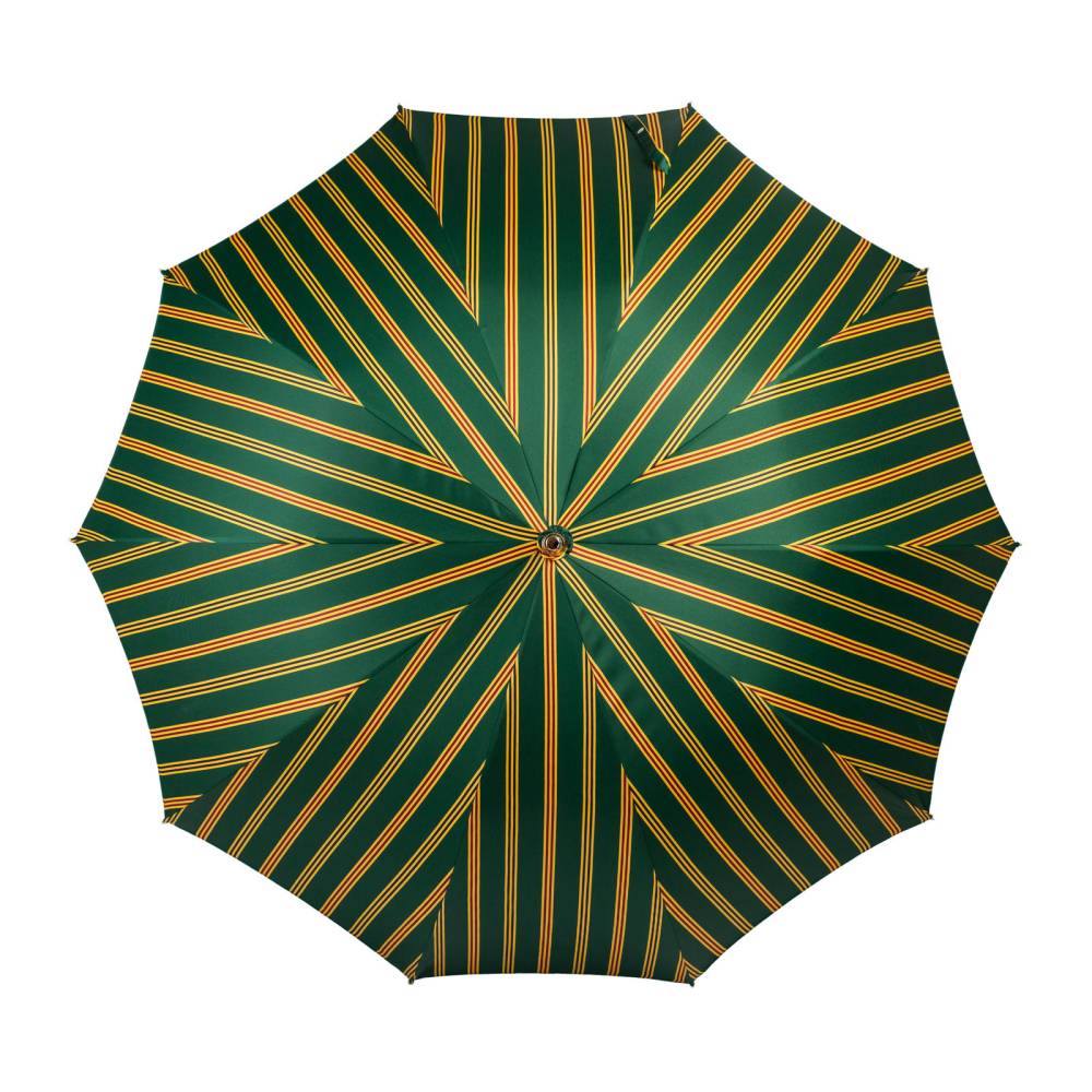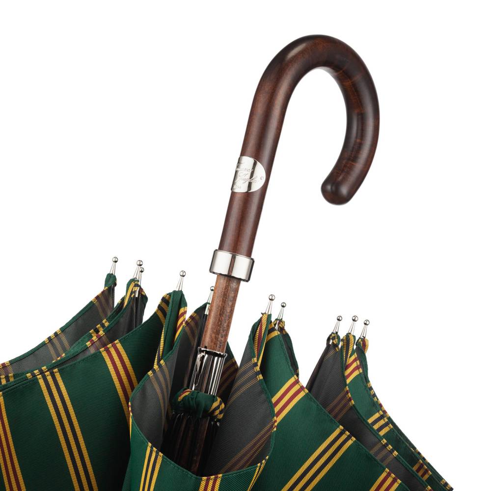 Респектабельный мужской зонт-трость Maglia Francesco, изготовленный по специальному заказу Checkroom. Купол выполнен из гладкого высококачественного полиэстера зелёного цвета с яркими полосами. Удобная рукоять классической изогнутой формы изготовлена из тёмной древесины клёна. Металлический каркас. Стержень из прочной древесины бука. Верхняя часть стрежня дополнена металлическим наконечником, защищающим дерево от сколов. Рукоять украшена шильдом с выгравированным логотипом бренда.