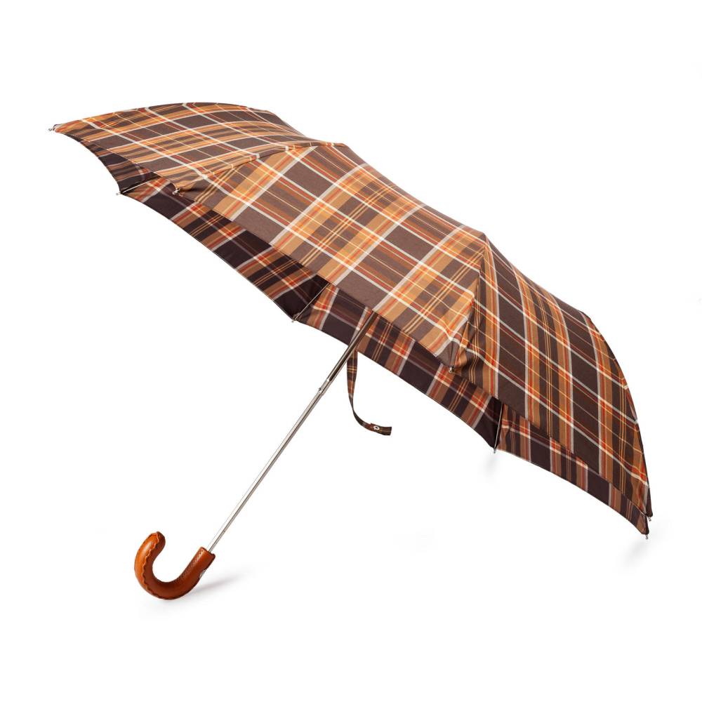 Компактный мужской складной зонт Maglia Francesco. Купол выполнен из плотной ткани с традиционным орнаментом "тартан", в состав которой входят хлопок и полиэстер. Металлический каркас. Стержень выполнен из лёгкого полированной металла, а ручка обтянута натуральной телячьей кожей. Также ручка украшена шильдом с выгравированным логотипом бренда. К зонту прилагается чехол из той же ткани, что и купол.