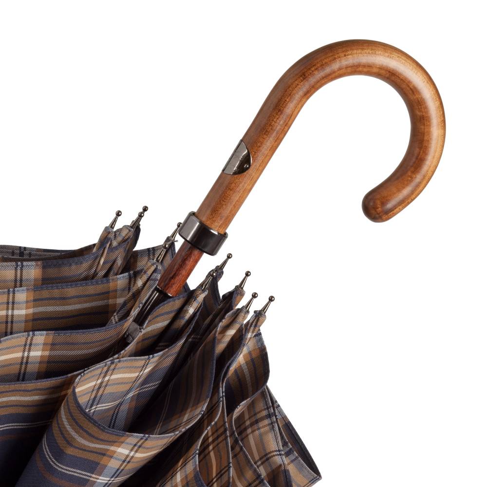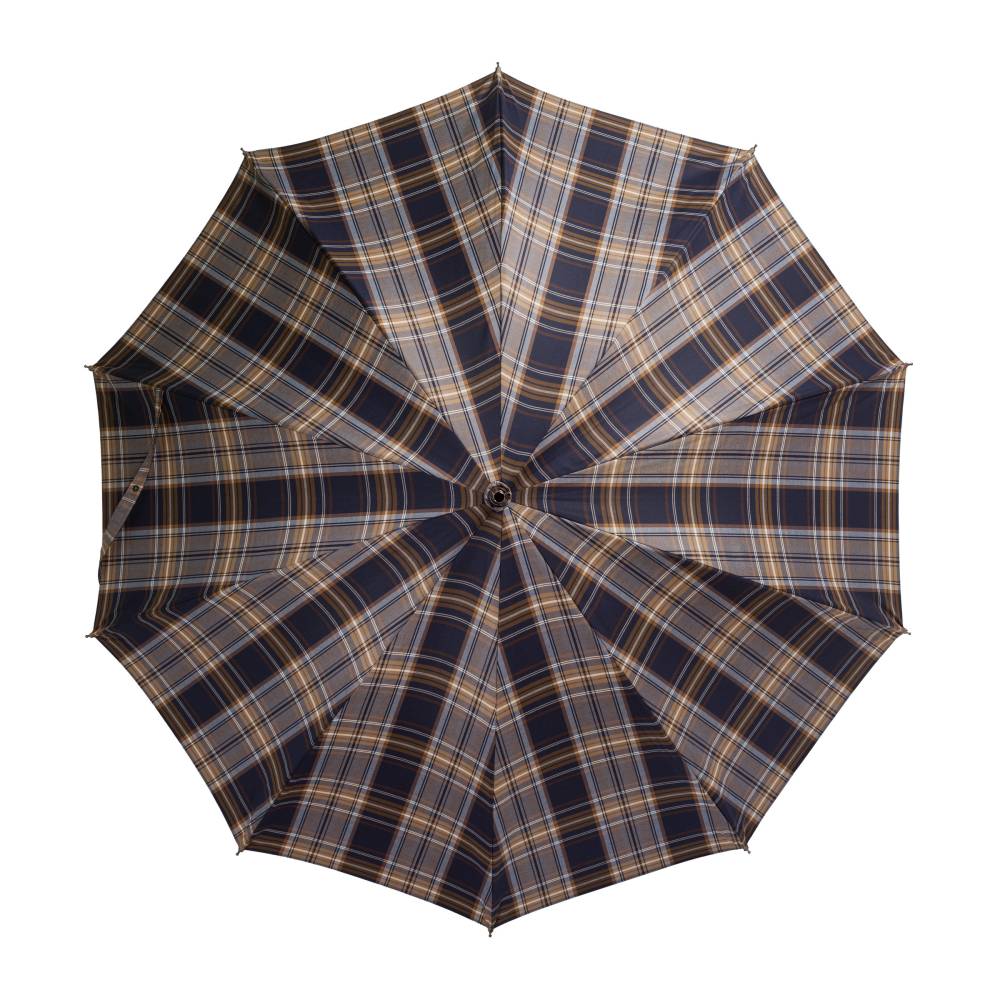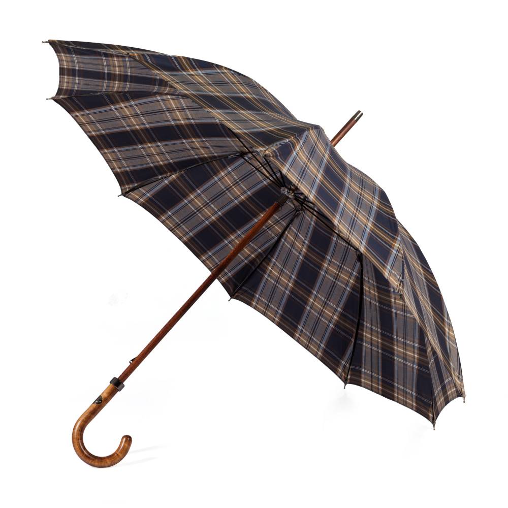Респектабельный мужской зонт-трость от итальянской мануфактуры Maglia Francesco, изготовленный по специальному заказу Checkroom. Купол выполнен из плотной износостойкой клетчатой ткани бежевых и синих оттенков (60% хлопка, 40% полиэстера). Кленовый стержень и рукоять были обработаны огнём для создания неповторимого леопардового окраса и покрыты матовым лаком. Модель дополнена элементами из полированного металла: наконечником, защищающим стержень от сколов, и шильдом c выгравированным логотипами Maglia Francesco и Checkroom. К зонту прилагаются чехол из полиамида и текстильный хлопковый кофр для хранения.