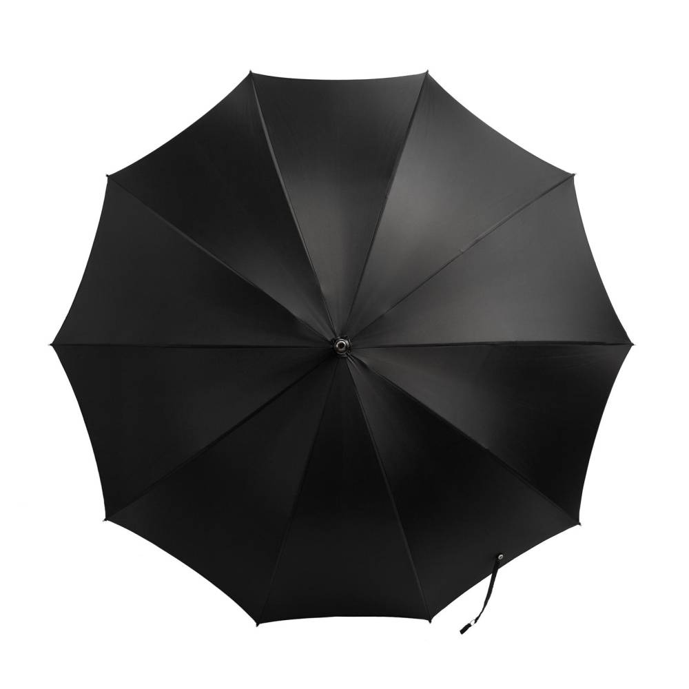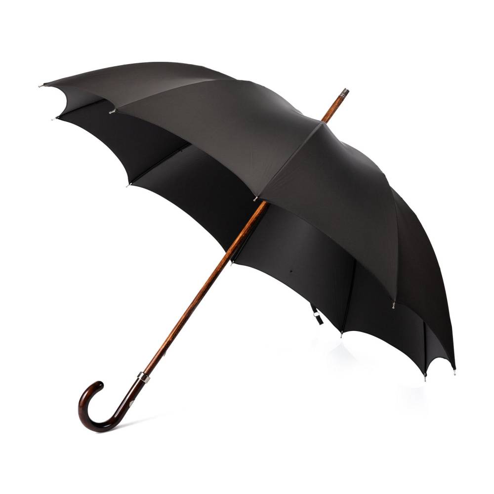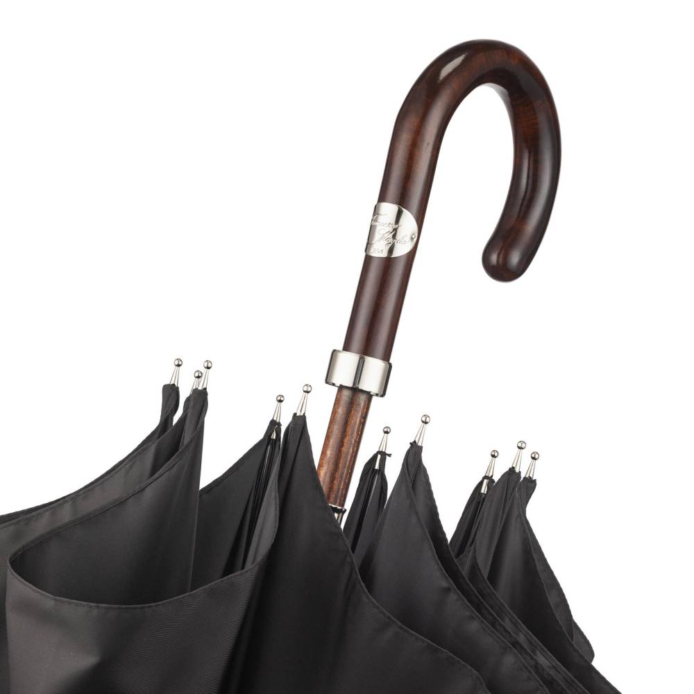 Респектабельный мужской зонт-трость Maglia Francesco, изготовленный по специальному заказу Checkroom. Купол выполнен из гладкого высококачественного полиэстера чёрного. Удобная рукоять классической изогнутой формы изготовлена из тёмной древесины клёна, покрытой лаком. Металлический каркас. Стержень из прочной древесины бука. Верхняя часть стрежня дополнена металлическим наконечником, защищающим дерево от сколов. Рукоять украшена шильдом с выгравированным логотипом бренда.