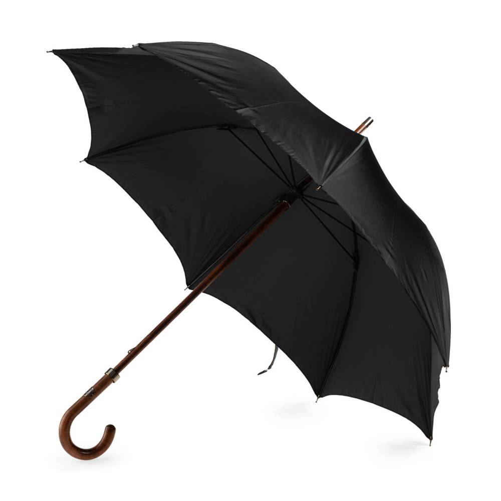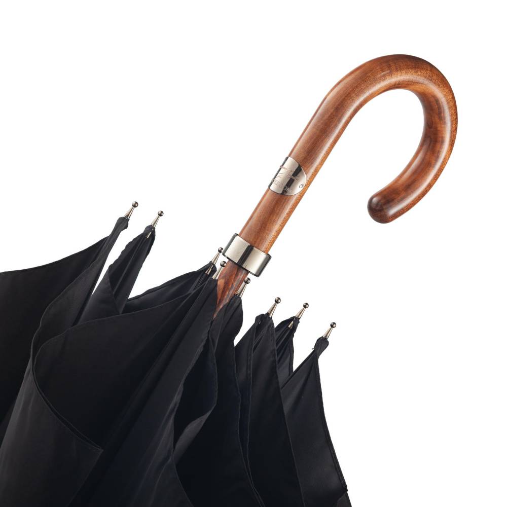 Классический мужской зонт-трость Maglia Francesco с объёмным куполом из гладкой ткани чёрного цвета. Стержень и рукоять выполнены из клёна. По заказу бутика Checkroom модель дополнена элементами из полированного металла: наконечником, защищающим стержень от сколов и шильдом c выгравированным логотипом компании. К зонту прилагается текстильный хлопковый кофр для хранения.