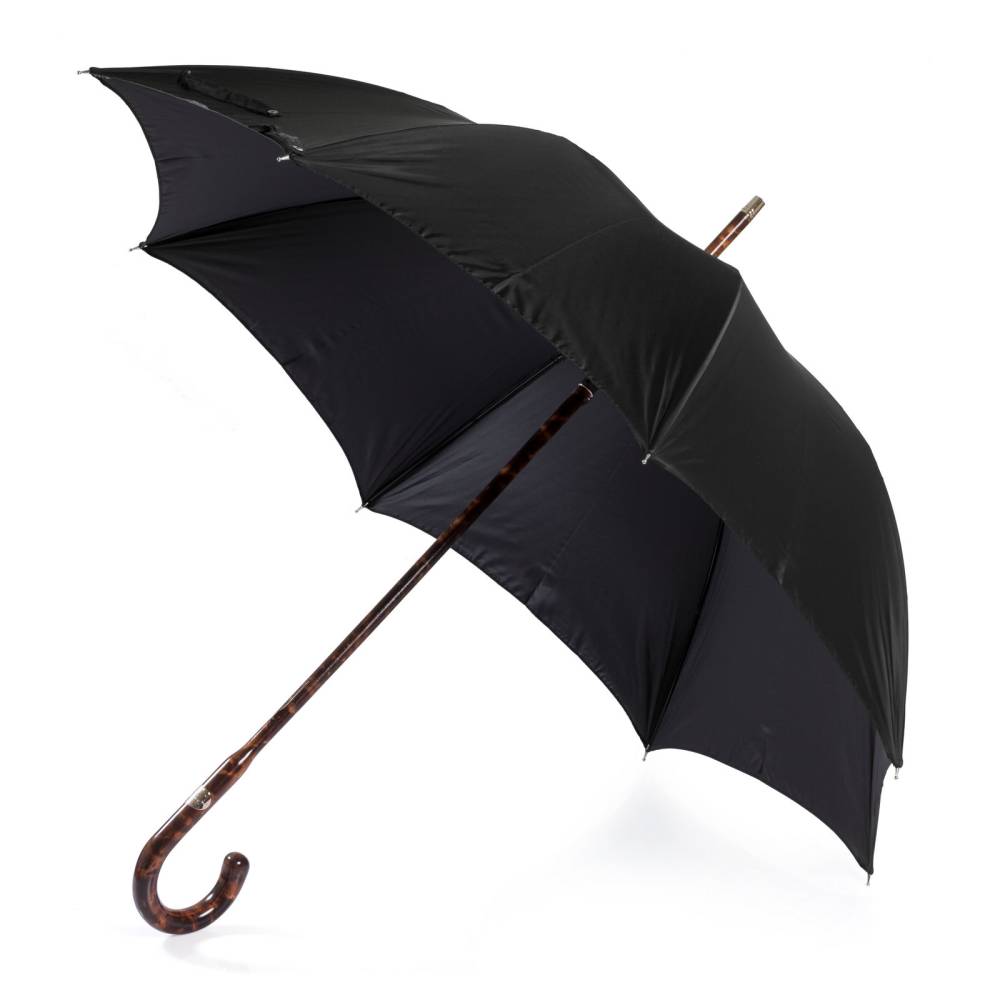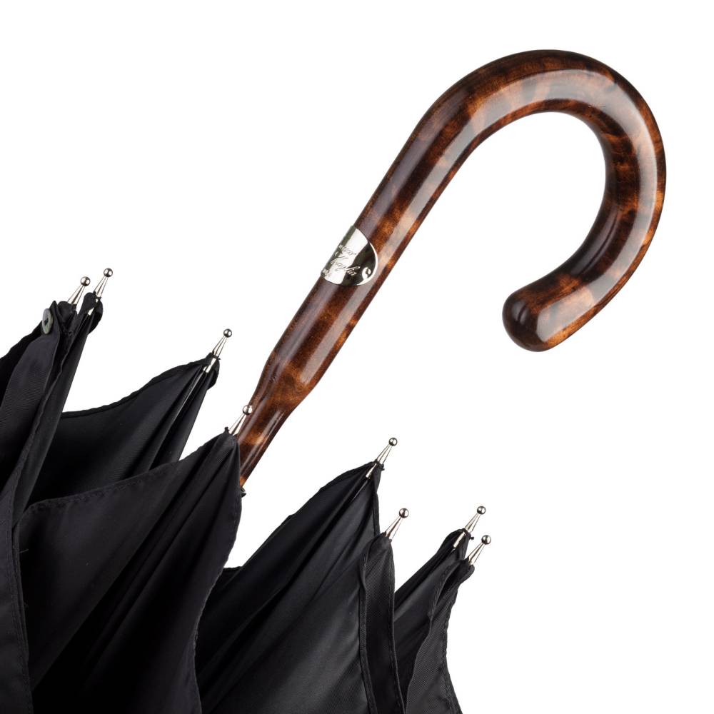 Респектабельный мужской зонт-трость от итальянской мануфактуры Maglia Francesco. Купол выполнен из мягкого высококачественного полиамида чёрного цвета. По уникальной технологии рукоять и стержень выточены из единого бруска клёна. После этого древесина была обработана огнём для создания неповторимого леопардового окраса и покрыта глянцевым лаком. Модель дополнена элементами из полированного металла: наконечником, защищающим стержень от сколов и шильдом c выгравированным логотипом компании. К зонту прилагаются чехол из полиамида и текстильный хлопковый кофр для хранения.
