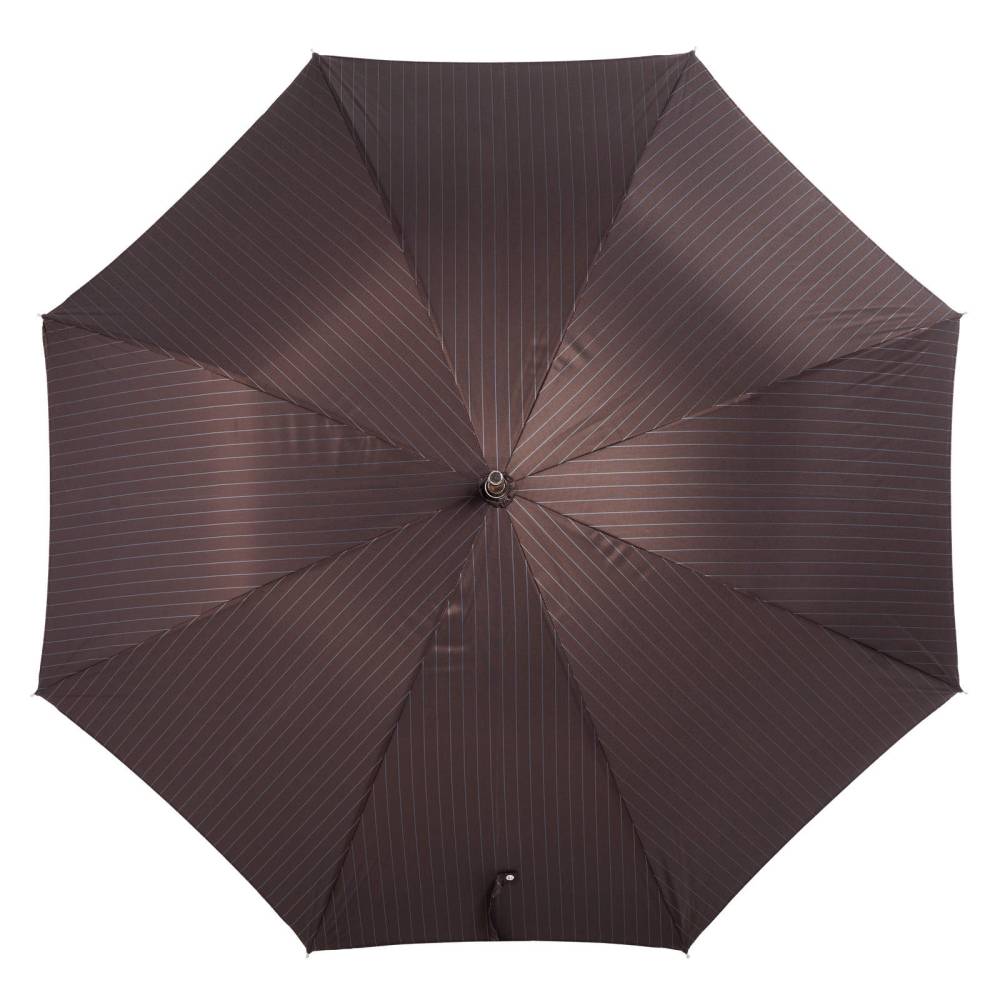 Классический мужской зонт-трость Pasotti с объёмным куполом из тёмно-коричневого в полиэстра в полоску, на металлическом каркасе. Стержень и рукоять, односоставные, выполнены из цельной древесины ореха. Модель дополнена защитным, металлическим наконечником предохраняющим стержень от повреждений при соприкосновении с асфальтом. Рукоять украшена металлическим шильдом с выгравированным логотипом компании. Каждая трость данной модели, имеет свой неповторимый узор и форму.