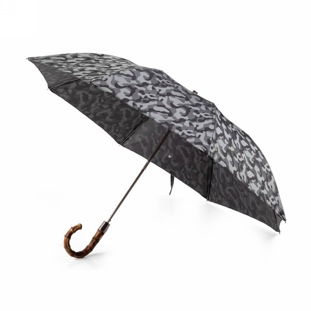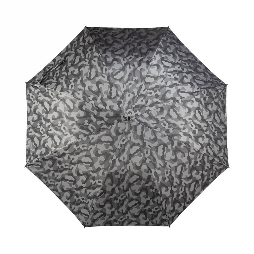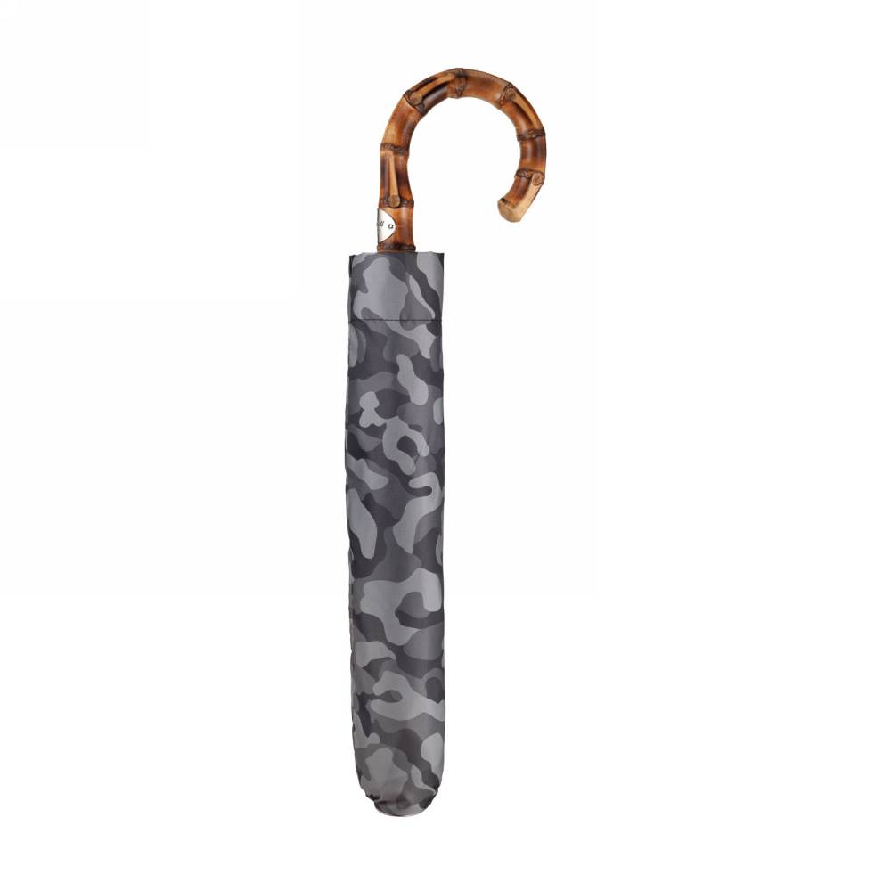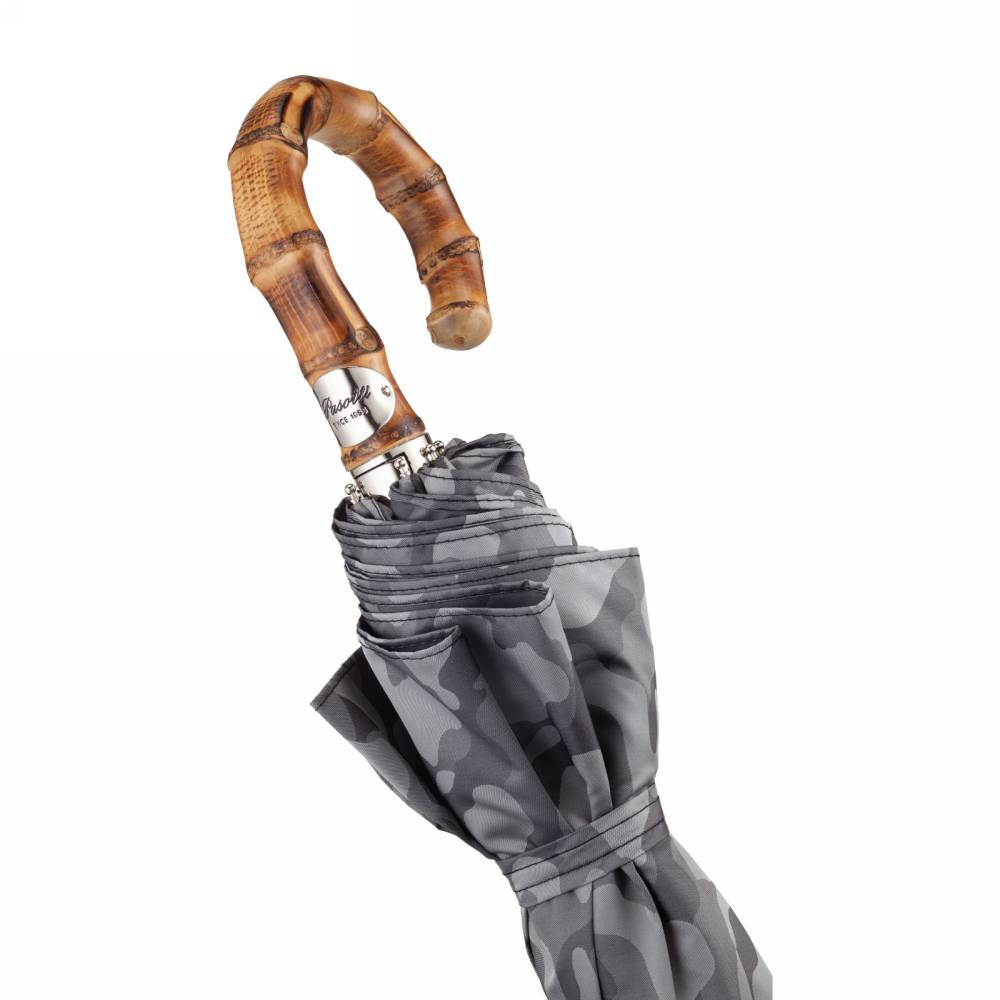 Компактный складной зонт-полуавтомат Pasotti на металлическом каркасе с объёмным куполом серого цвета с узнаваемым камуфляжным принтом. Модель имеет металлический стержень и рукоять из древесины бамбука. Рукоять украшена металлическим шильдом с выгравированным логотипом компании. К зонту прилагается чехол из той же ткани, что и купол.