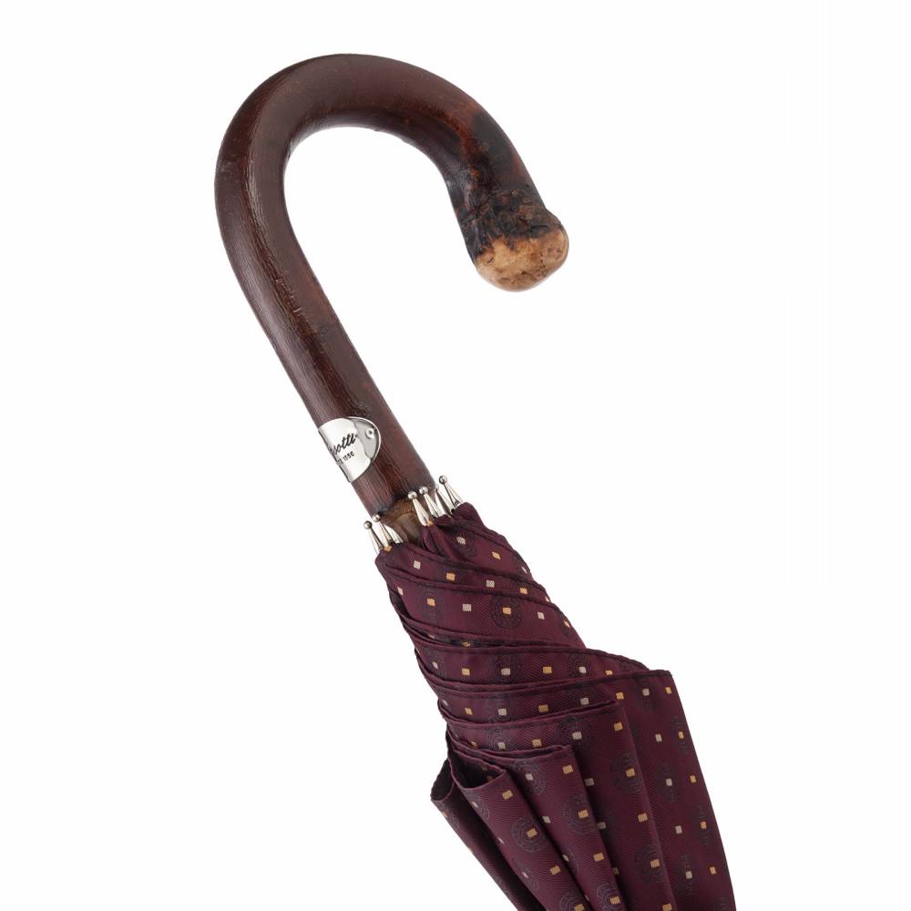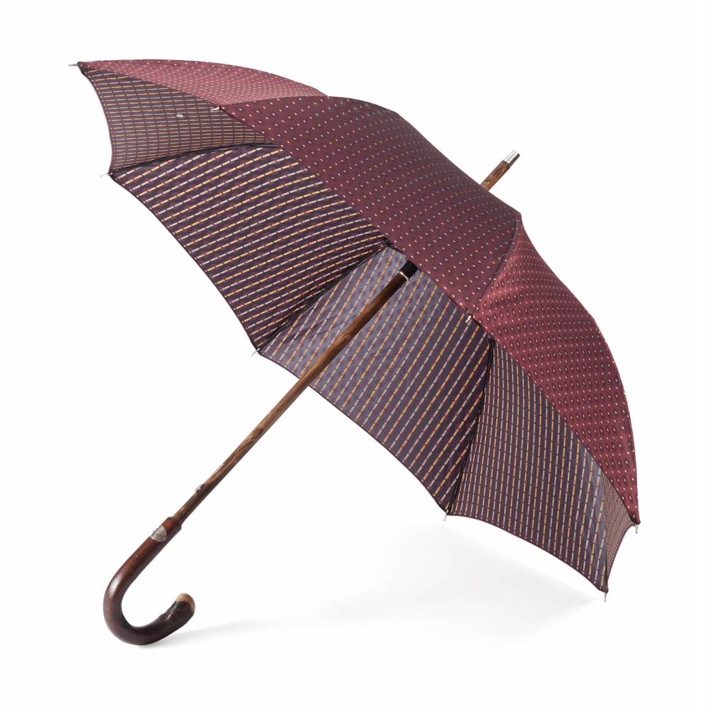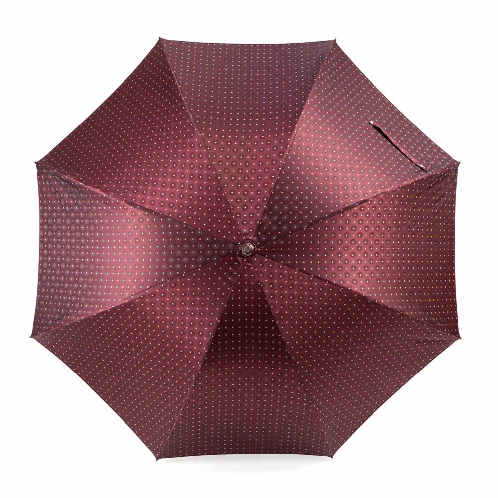 Классический мужской зонт-трость Pasotti на металлическом каркасе с объёмным куполом из полиэстра с разноцветными геометрическими узорами. Стержень и рукаять односоставные, выполнены из древесины ореха. Модель дополнена металлическим наконечником, защищающим стержень от сколов при соприкосновении с асфальтом. На рукояти закреплён металлический шильд с выгравированным логотипом компании.