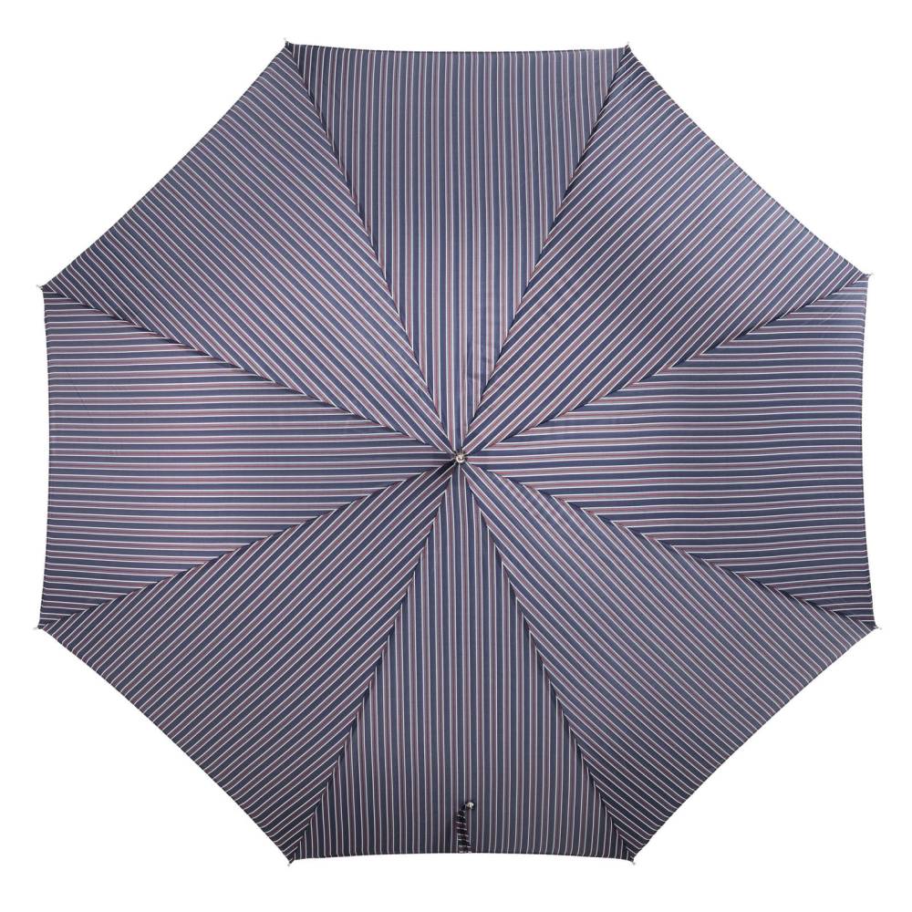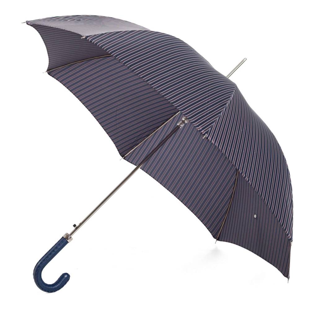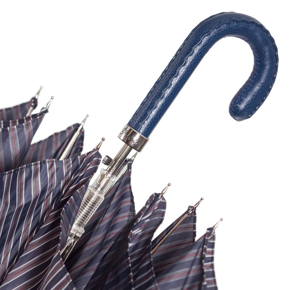 Полуавтоматический мужской зонт-трость Pasotti с объёмным куполом из тёмно-синего полиэстера в полоску винного оттенка на металлическом каркасе. Стержень и ручка выполнены из хромированной нержавеющей стали. Модель дополнена защитным металлическим наконечником защищающего стержень при соприкосновении с асфальтом. Рукоять выполненна из зернистой кожи, тёмно-синего цвета, а так же украшена металлическим кольцом с выгравированным логотипом компании.