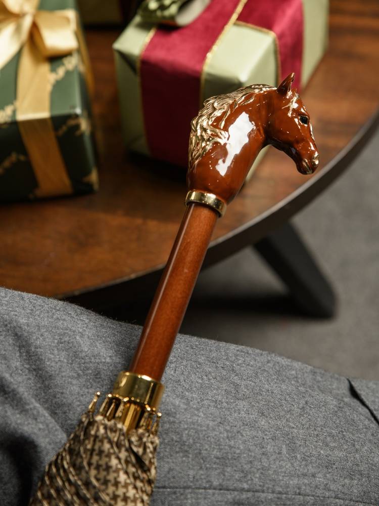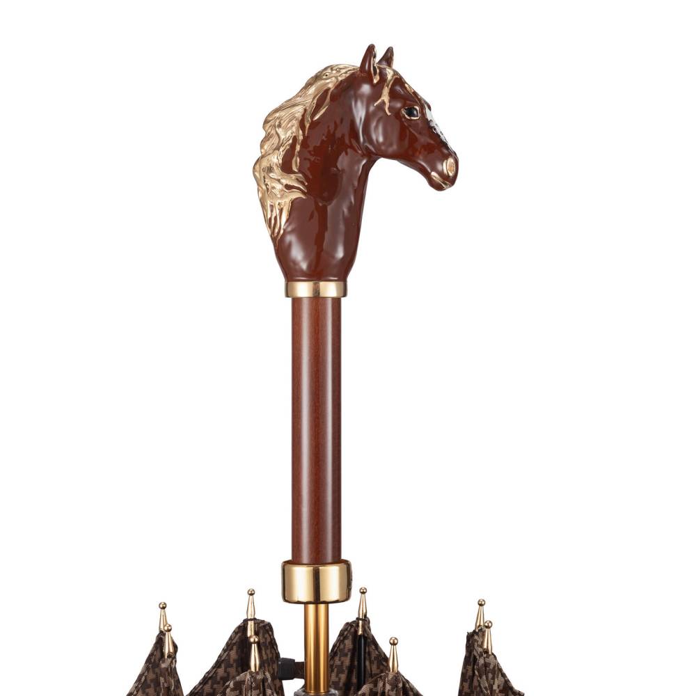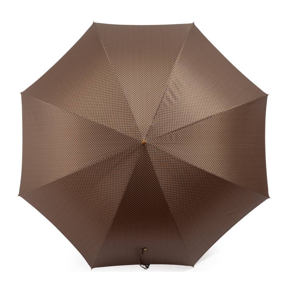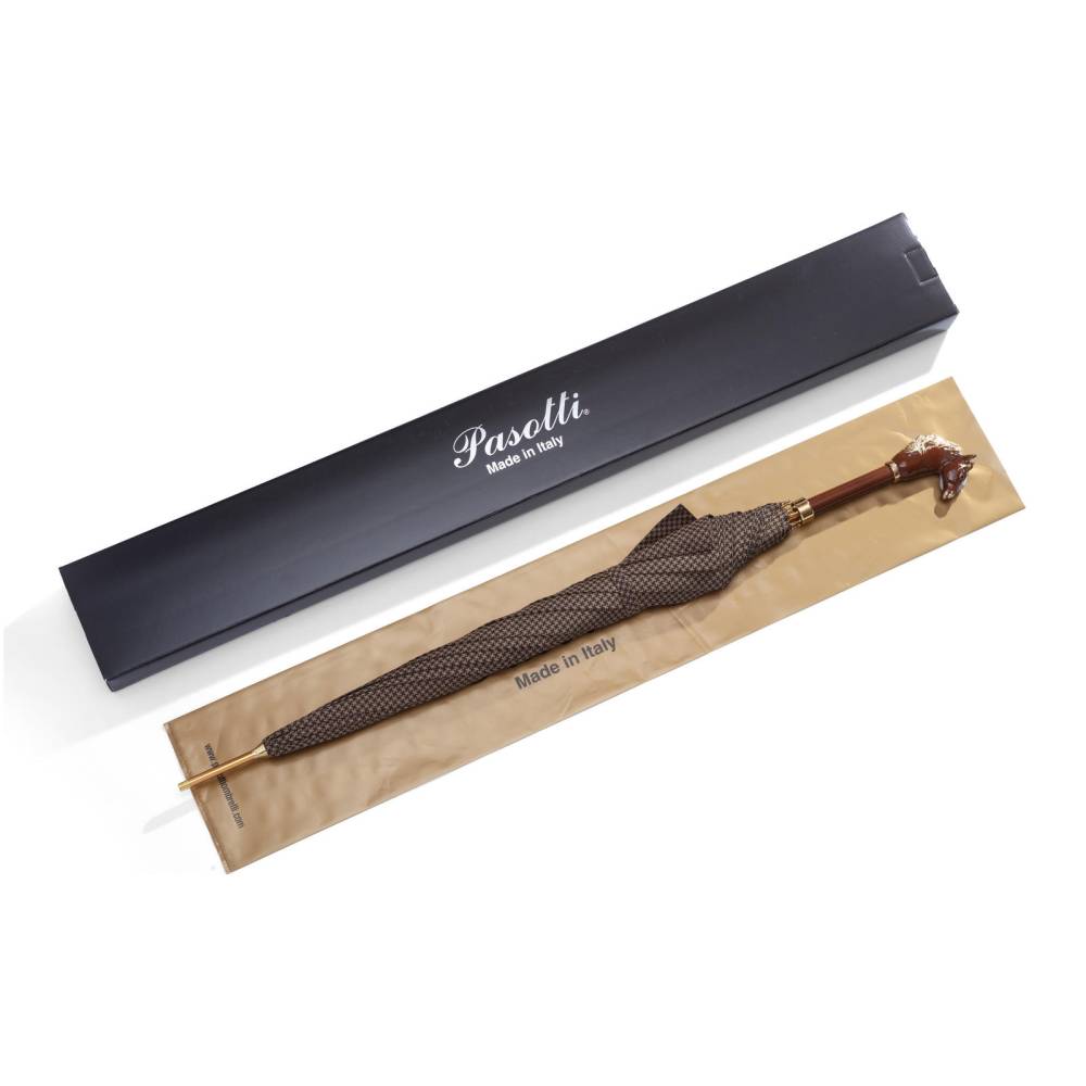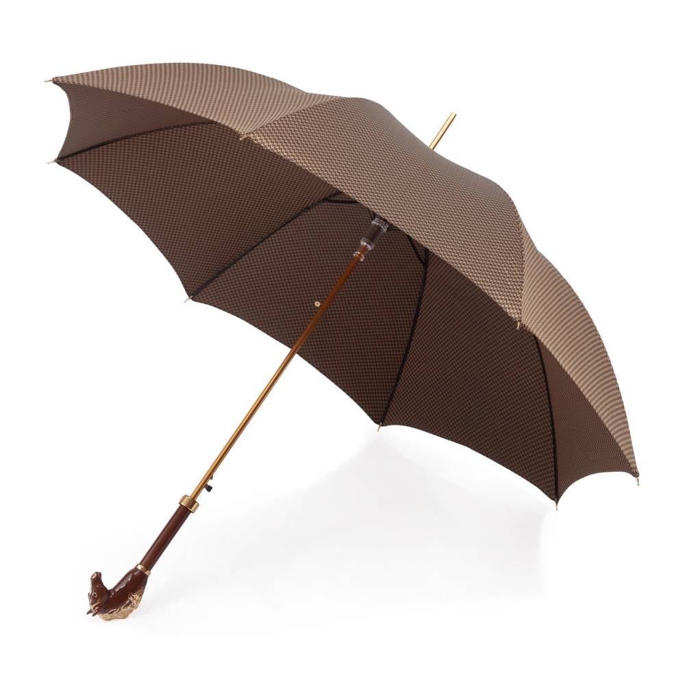Классический мужской зонт-трость Pasotti с полуавтоматическим открытием, изготовленный полностью вручную. Прочный металлический каркас дополнен объёмным куполом из коричневого полиэстера с узором "собачий зуб" (houndstooth). Рукоять выполнена из лакированной древесины бука и украшена наконечником в виде головы лошади из эмалированной латуни. Модель оснащена металлическим наконечником для защиты от повреждений при соприкосновении с асфальтом.