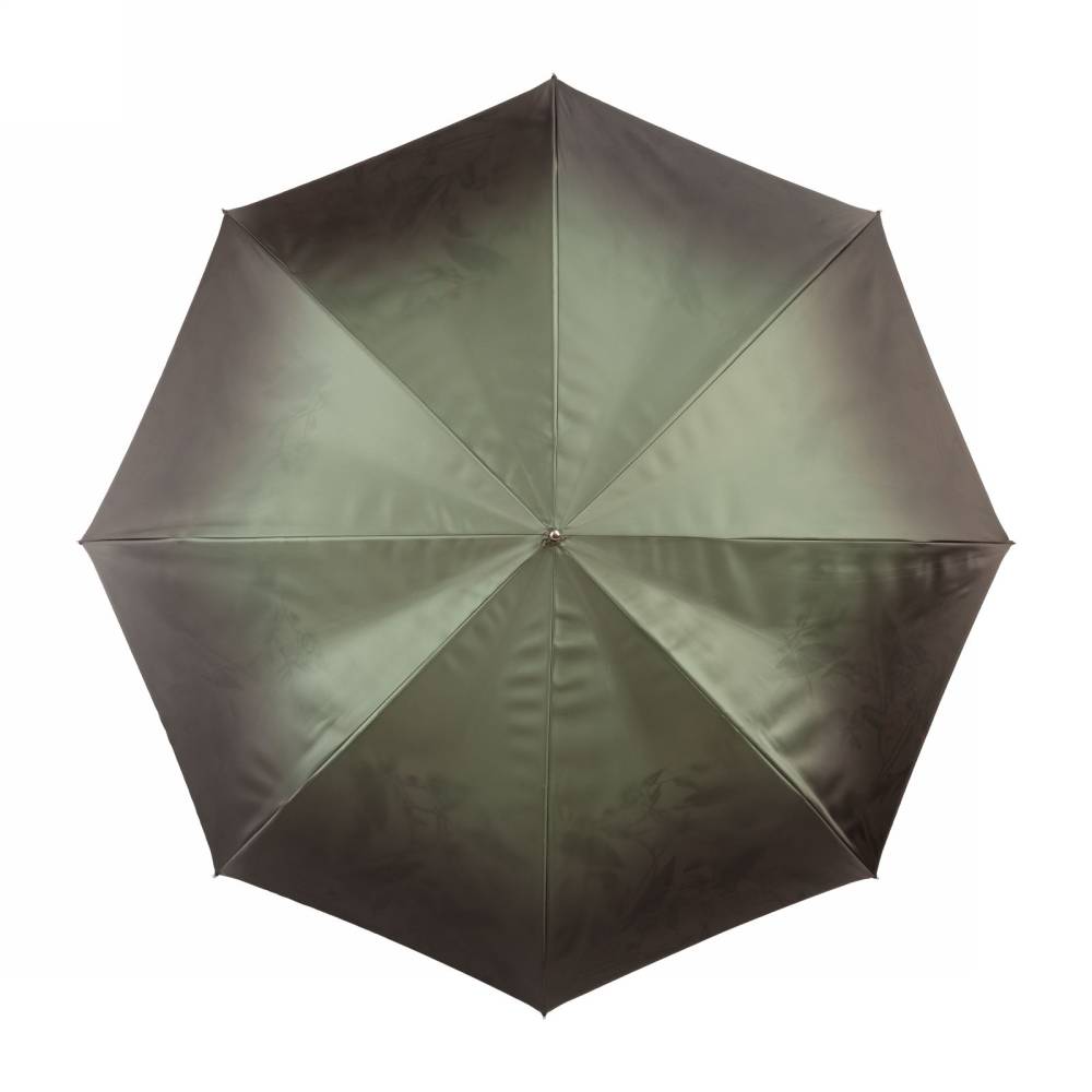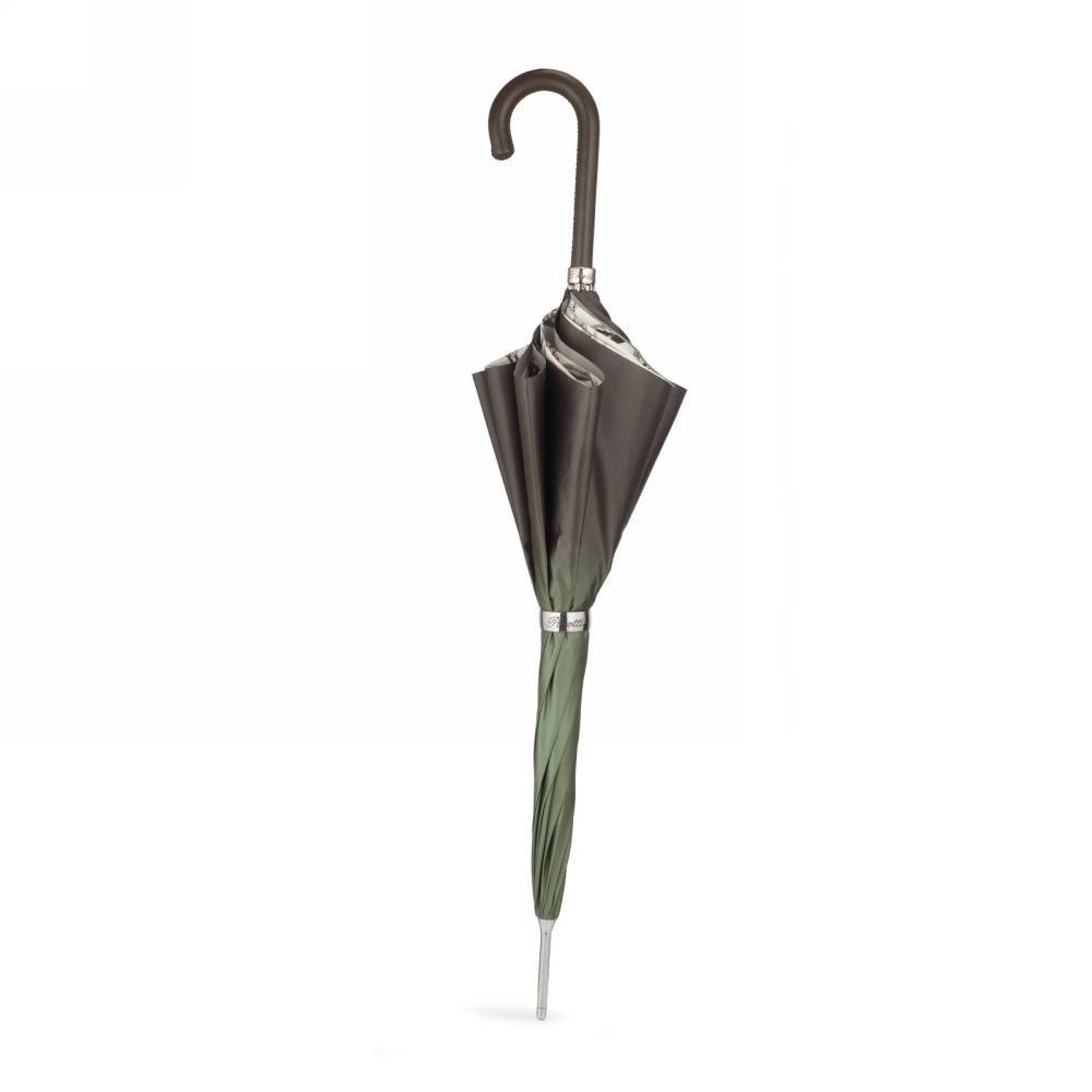 Роскошный женский зонт-трость Pasotti с объёмным куполом из двухслойного полиэстера. С внешней стороны тёмно-зелёный оттенок, а внутри яркие флористические принты в этой же цветовой гамме на светлом фоне. Металлический стержень. Рукоять из натуральной кожи тёмно-зелёного цвета. Открывается и закрывается вручную. К модели прилагается металлическое кольцо для сборки купола и подарочная коробка.