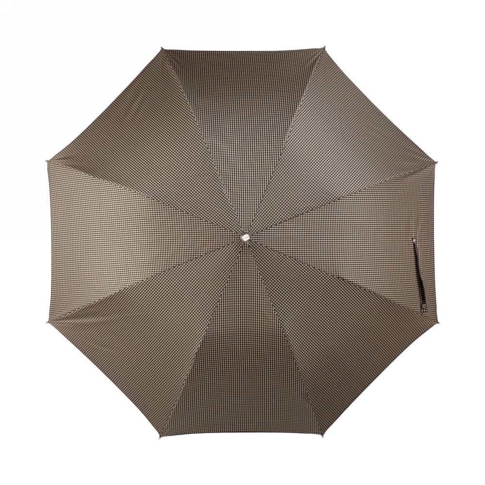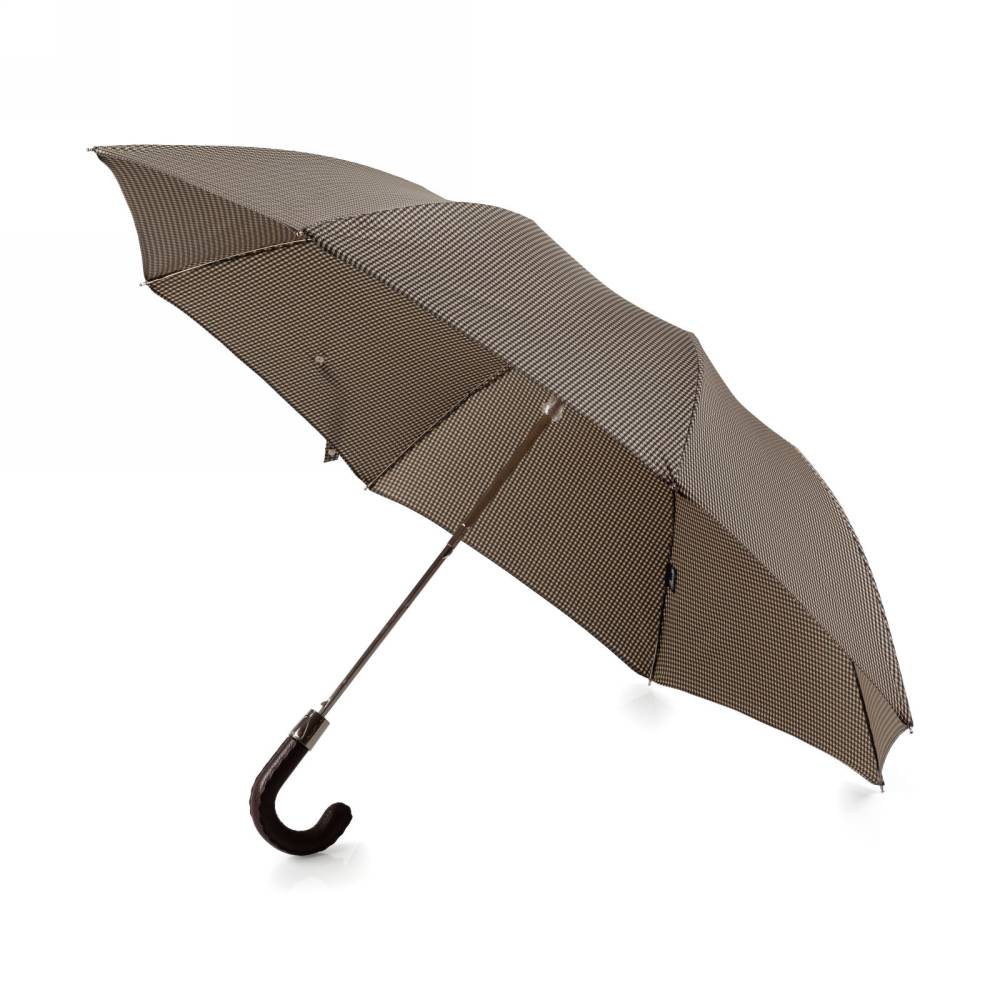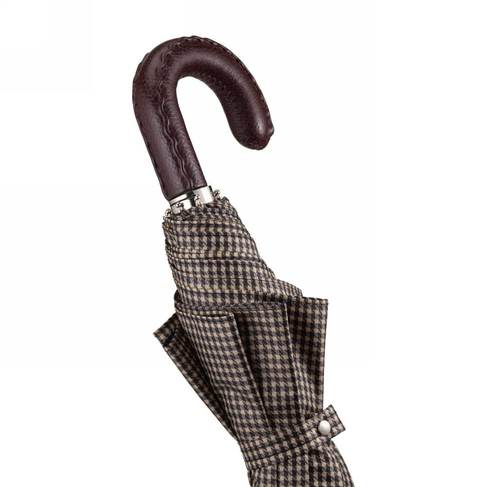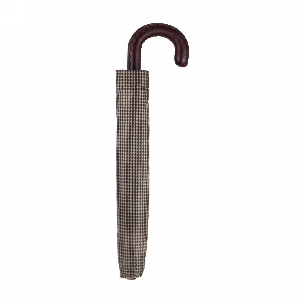 Компактный складной зонт-полуавтомат Pasotti на металлическом каркасе с объёмным куполом из бежевого полиэстра с орнаментом "гусиная лапка". Модель имеет металлический стержень и рукоять из пластика, обтянутого натуральной кожей. Рукоять украшена металлическим шильдом с выгравированным логотипом компании. К зонту прилагается чехол из той же ткани, что и купол.
