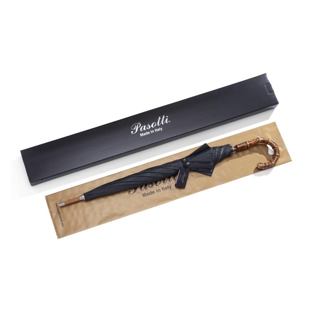 Классический мужской зонт-трость Pasotti с механическим открытием, изготовленный полностью вручную. Прочный металлический каркас дополнен объёмным куполом из тёмно-коричневого полиэстра с цветным узором фуляр. Стержень выполнен из цельной древесины бука, а рукоять из бамбука. Верхняя часть дополнена металлическим наконечником, защищающим от повреждений при соприкосновении с асфальтом. Рукоять украшена металлическим шильдом с выгравированным логотипом компании.