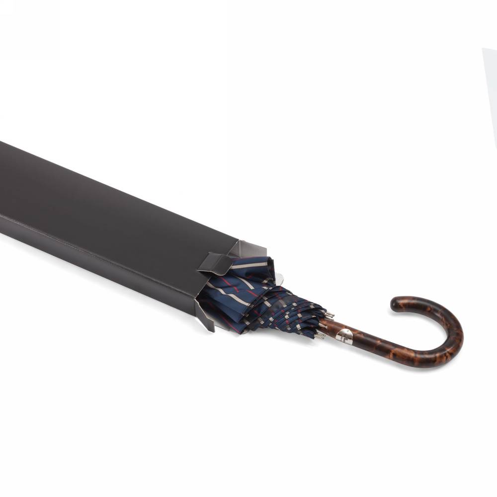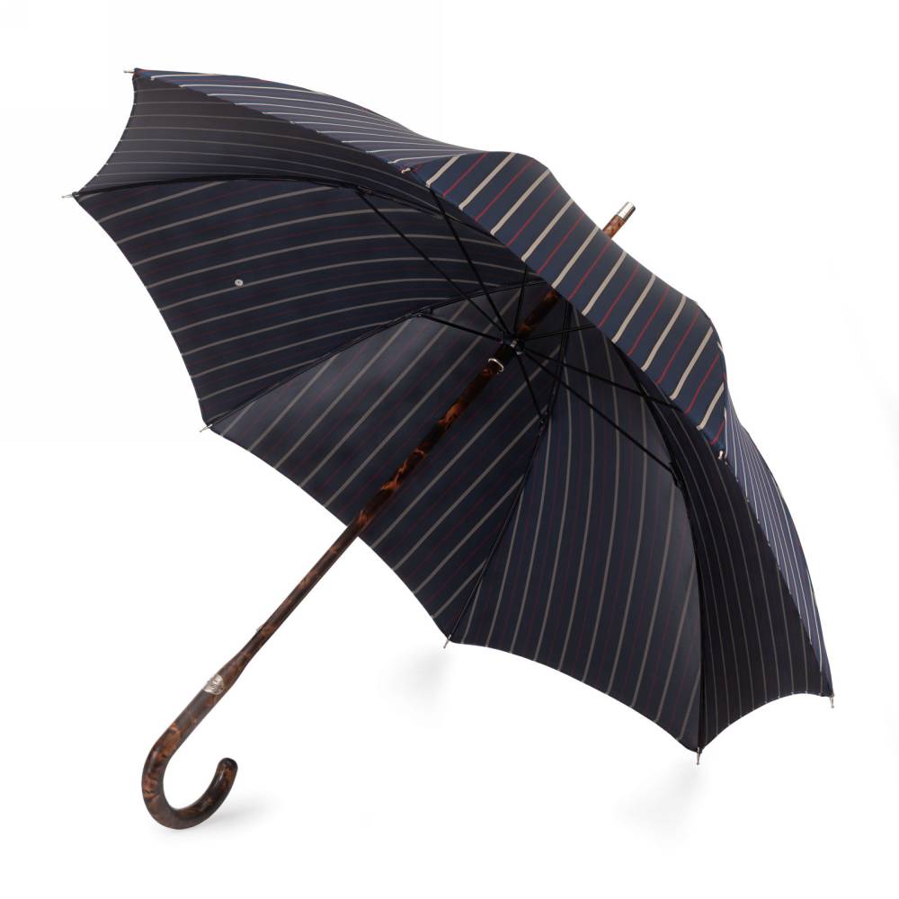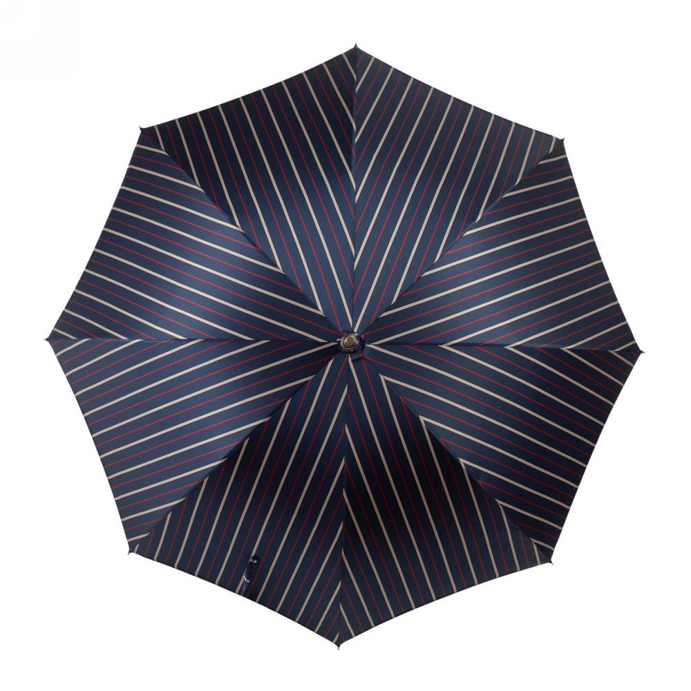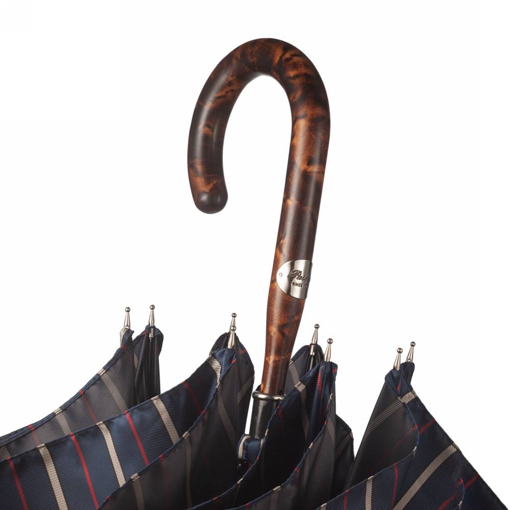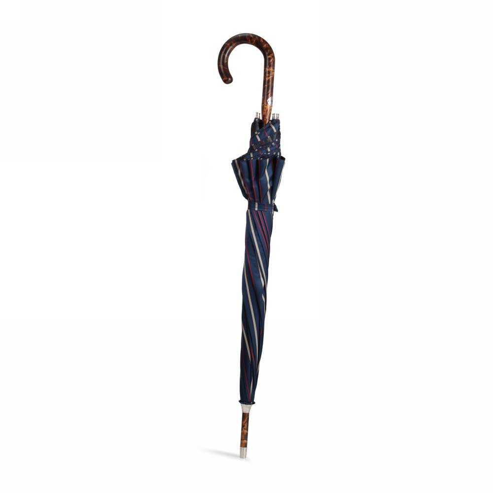 Классический мужской зонт-трость Pasotti с объёмным куполом из тёмно-синего полиэстра с красным и бежевыми полосами. Стержень и рукоять односоставные, выполнены из цельной древесины клёна. Благодаря обжигу, стержень имеет эффектный тигровый окрас. Верхняя часть дополнена металлическим наконечником, защищающим от повреждений при соприкосновении с асфальтом. Рукоять украшена металлическим шильдом с выгравированным логотипом компании.