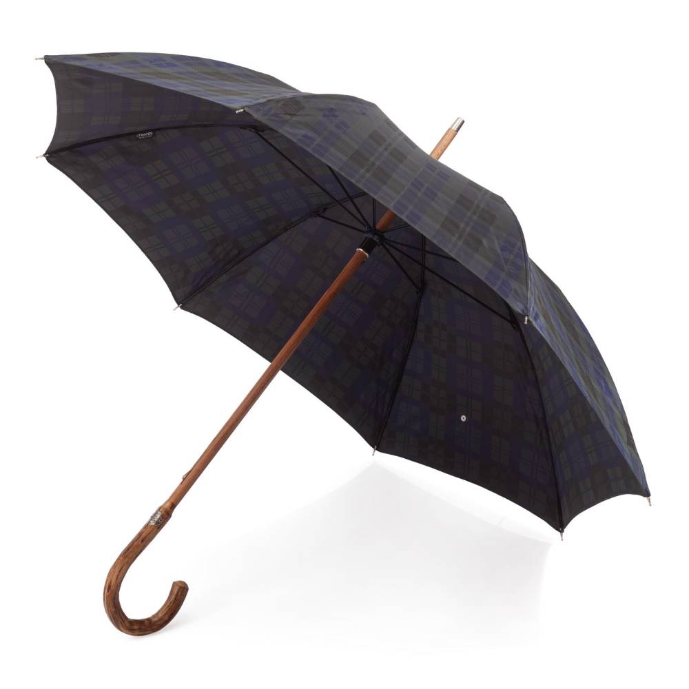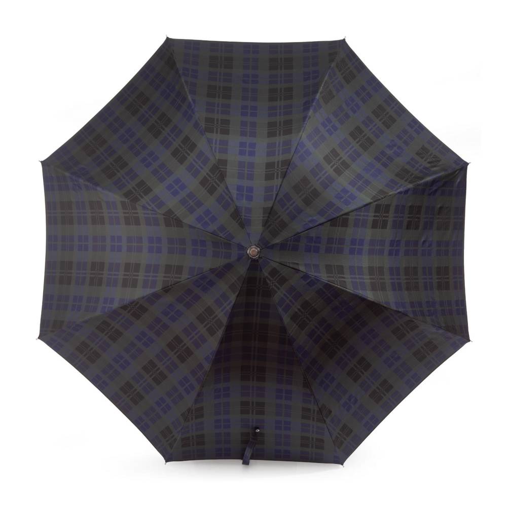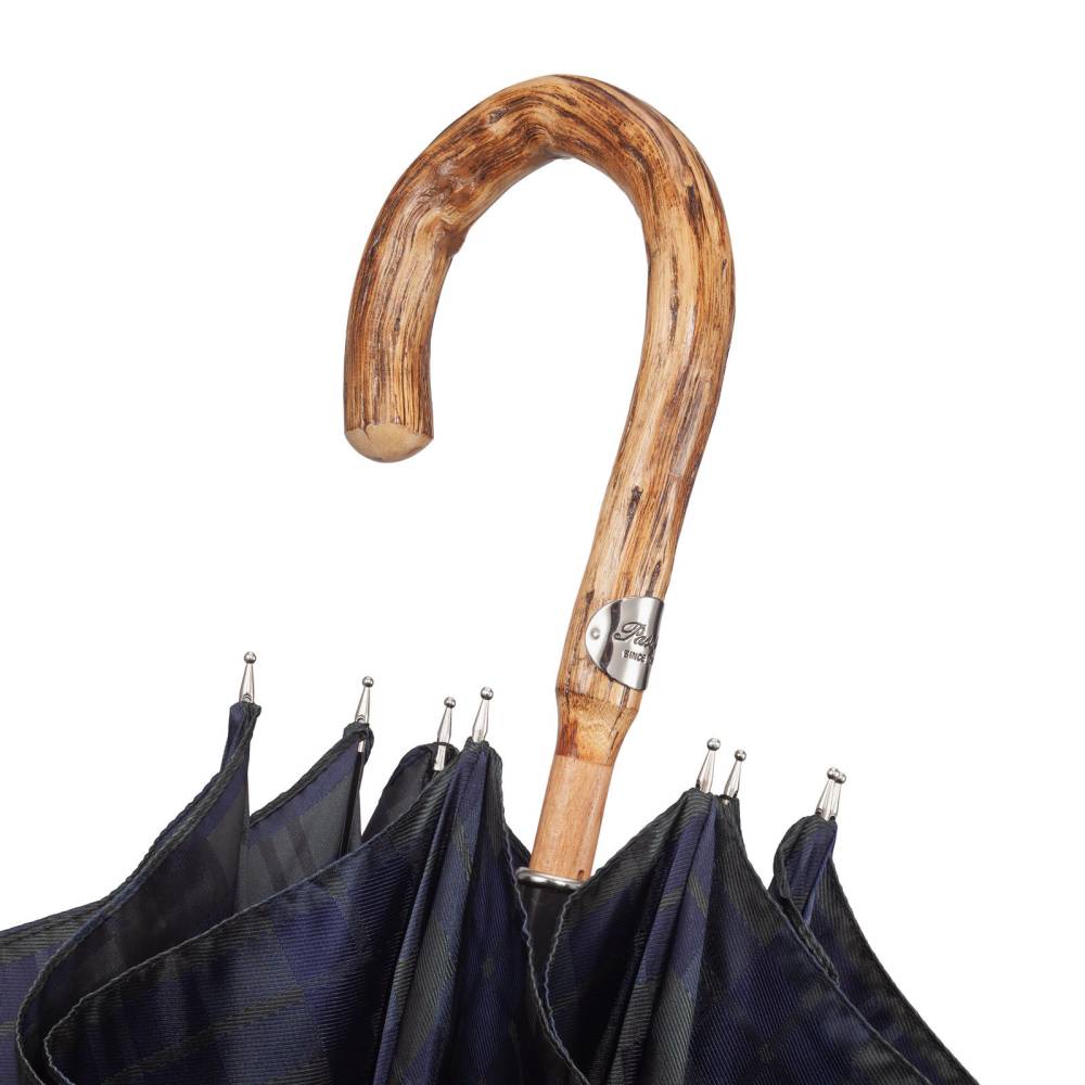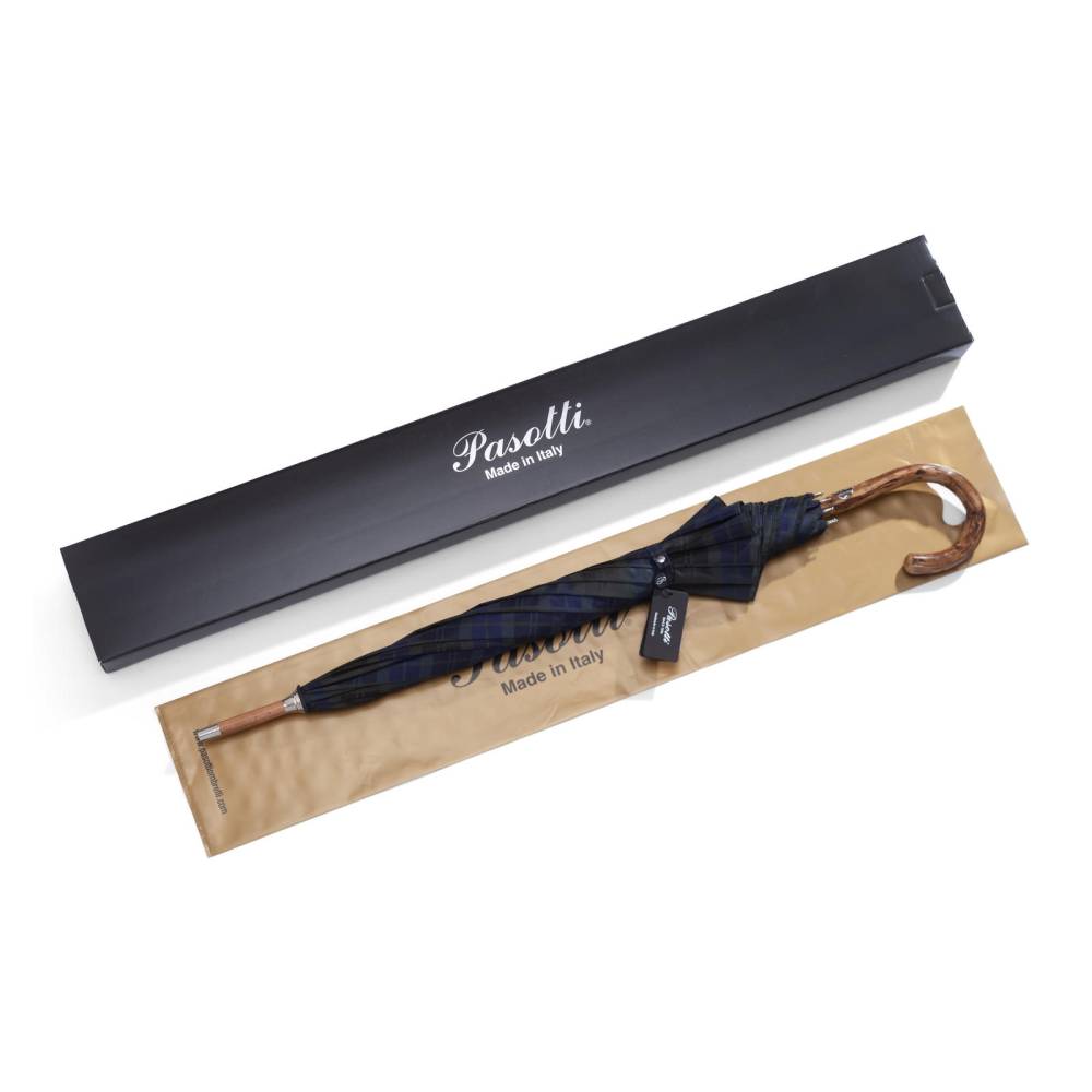 Классический мужской зонт-трость Pasotti с механическим открытием, изготовленный полностью вручную. Прочный металлический каркас дополнен объёмным куполом из тёмно-зелёного полиэстера в синюю клетку тартан. Стержень выполнен из бука, а рукоять из древесины утёсника с оригинальной фактурой. Модель дополнена металлическим наконечником, защищающим стержень от сколов и фирменным шильдом с выгравированным логотипом на рукояти.