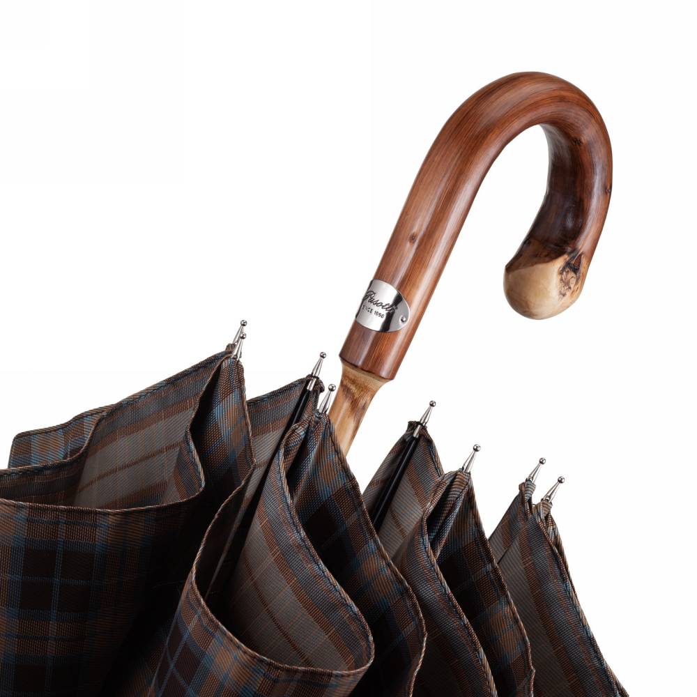 Классической мужской зонт-трость Pasotti на металлическом каркасе с объёмным куполом из плотного коричневого полиэстра с традиционным орнаментом "тартан". Стержень и рукоядь, односоставные, выполнены из цельной древесины ореха. Модель дополнена металлическим наконечником, защищающим стержень от сколов при соприкосновении с асфальтом. Рукоять украшена металлическим шильдом с выгравированным логотипом компании.