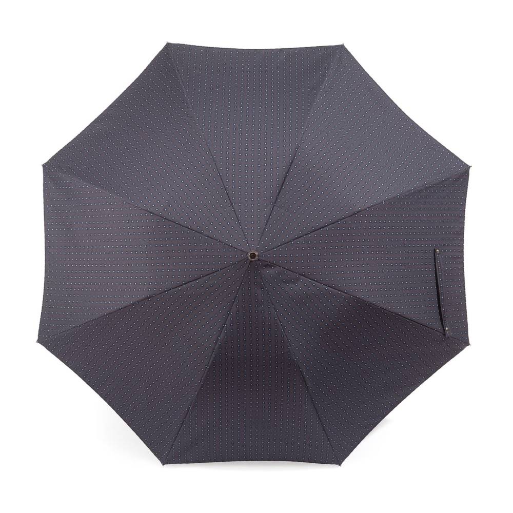 Компактный складной зонт-полуавтомат Pasotti изготовлен вручную в Италии. Прочный металлический каркас дополнен объёмным куполом из серого полиэстера с мелким узором из голубых квадратов. Модель оснащена металлическим стержнем и рукоятью из древесины бамбука, украшенной металлическим шильдом с выгравированным логотипом компании. К зонту прилагается чехол из той же ткани, что и купол.