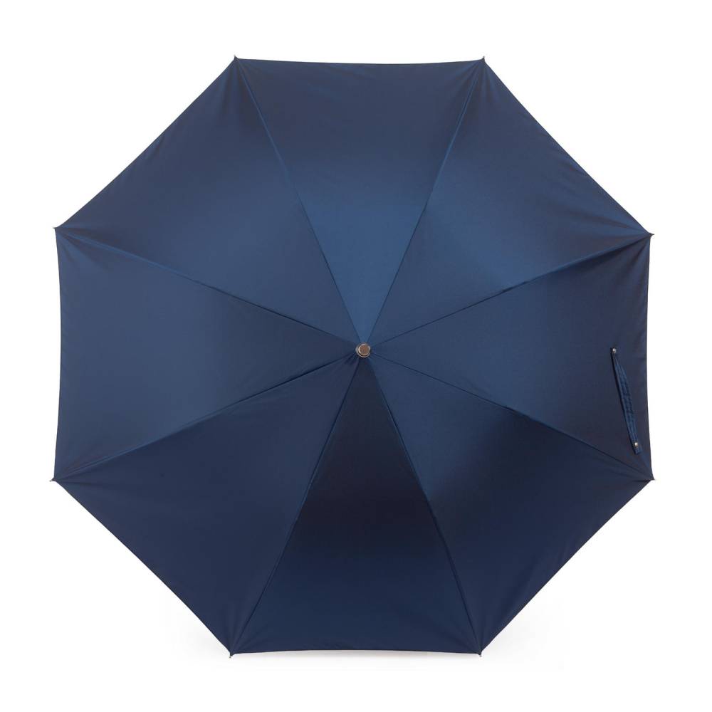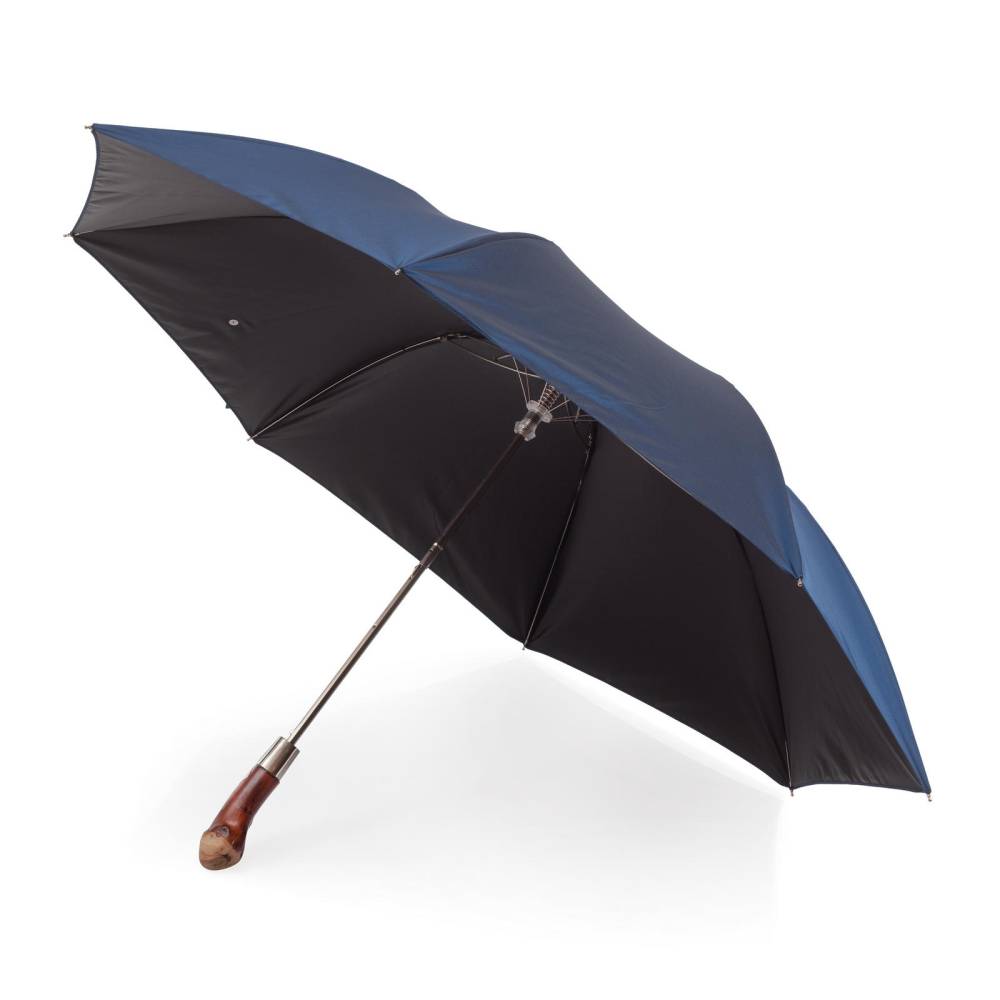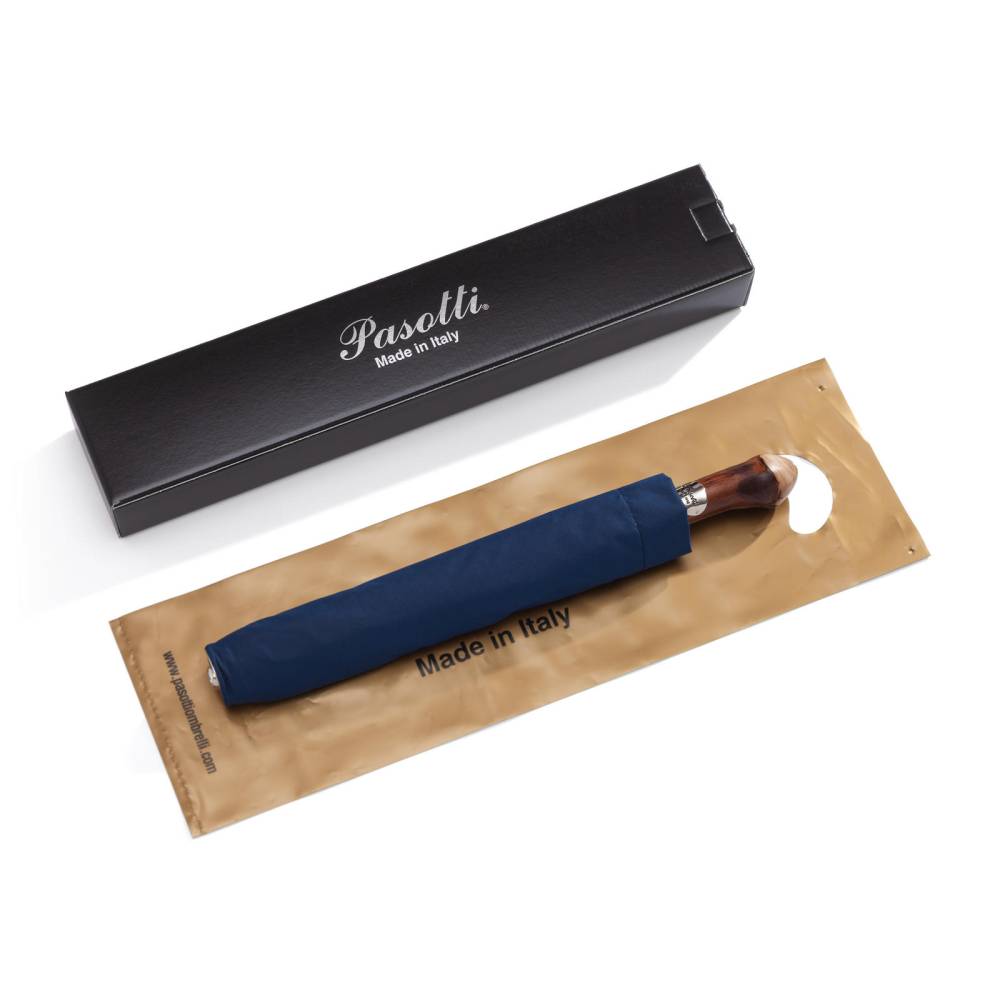 Компактный складной зонт-полуавтомат Pasotti изготовлен вручную в Италии. Прочный металлический каркас дополнен объёмным куполом из синего полиэстера. Модель оснащена металлическим стержнем и рукоятью из натуральной древесины ореха, украшенной металлическим шильдом с выгравированным логотипом компании. К зонту прилагается чехол из той же ткани, что и купол.