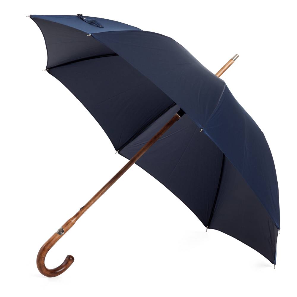 Классический мужской зонт-трость Pasotti с объёмным куполом из тёмно-синего полиэстра на металлическом каркасе. Стержень и рукоять, односоставные, выполнены из цельного клёна. Модель дополнена металлическим наконечником, защищающим стержень от сколов при соприкосновении с асфальтом. Рукоять украшена металлическим шильдом с выгравированным логотипом компании.