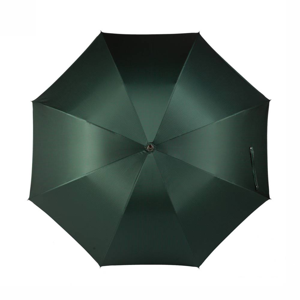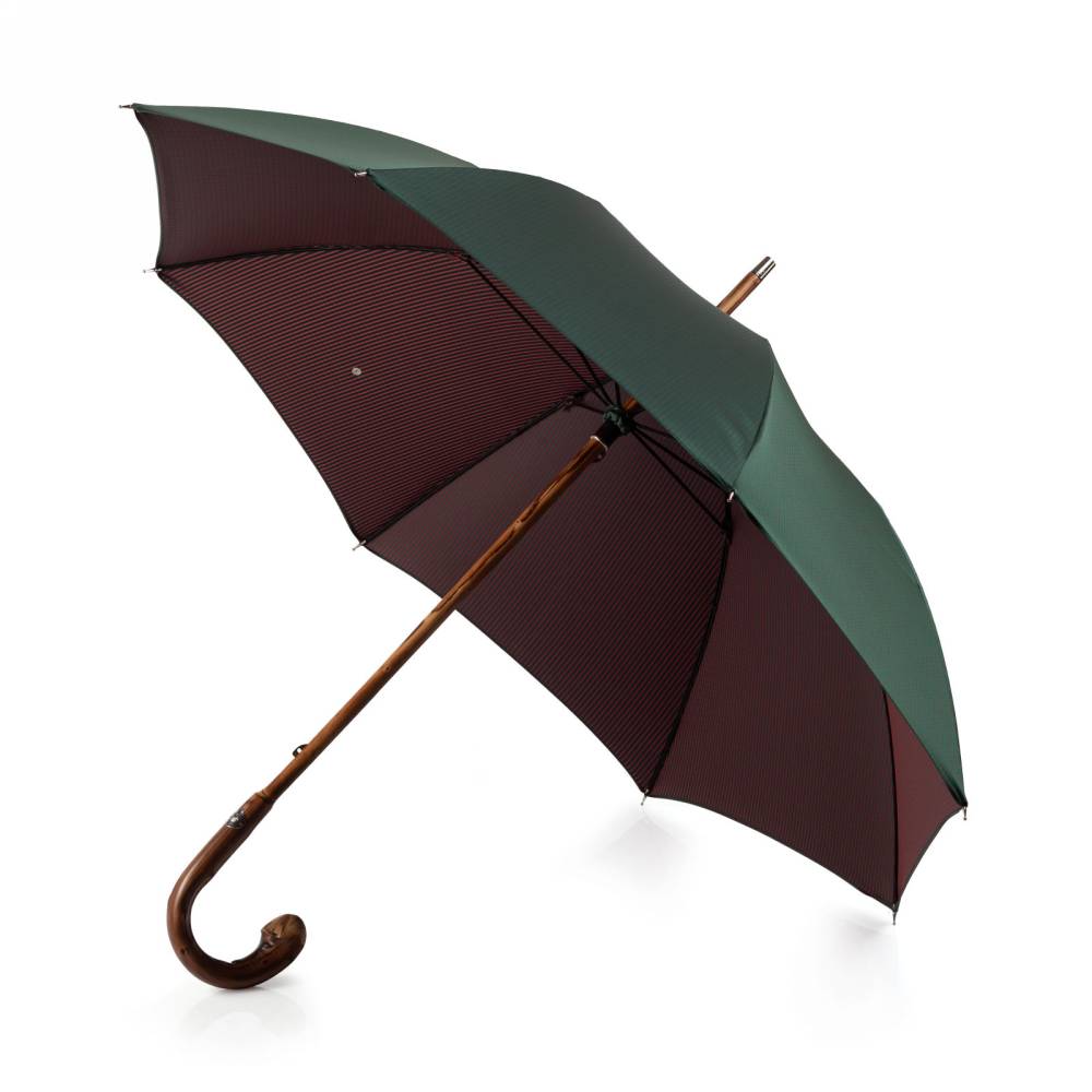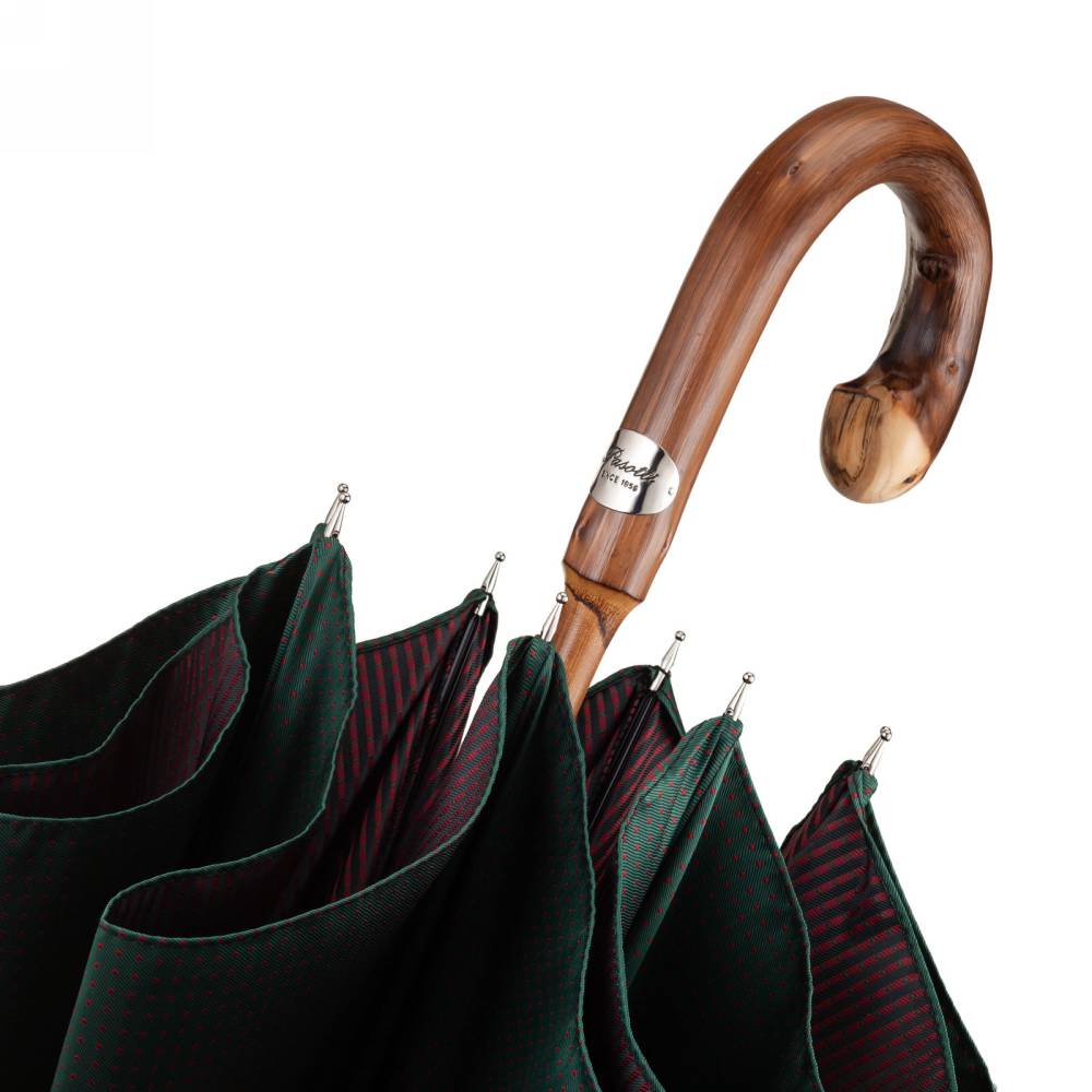 Классический мужской зонт-трость Pasotti на металлическом каркасе с объёмным куполом из зелёного полиэстра в мелкий красный горох. Стержень и рукоять, односоставные, выполнены из цельной древесины ореха. Модель дополнена металлическим наконечником, защищающим стержень от сколов при соприкосновении с асфальтом. Рукоять украшена металлическим шильдом с выгравированным логотипом компании.