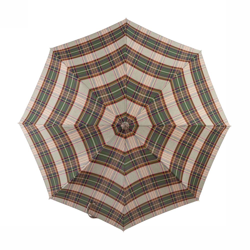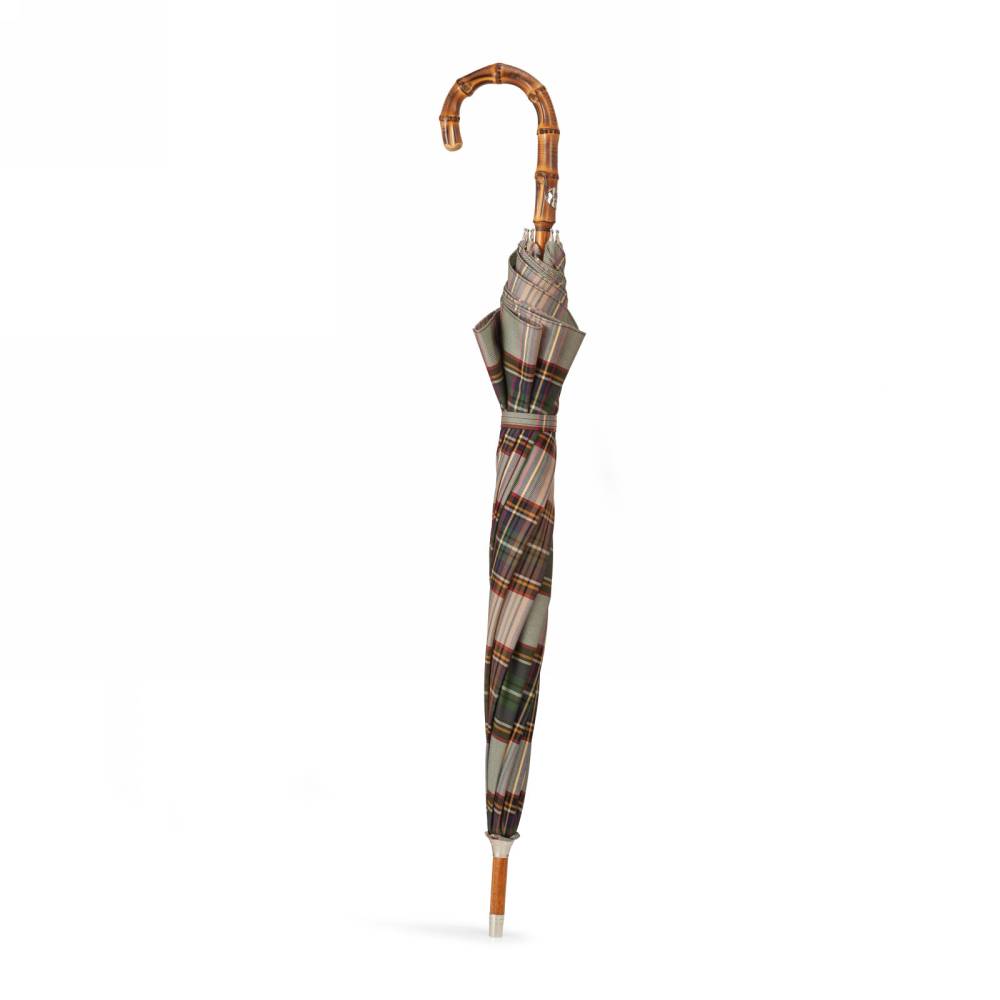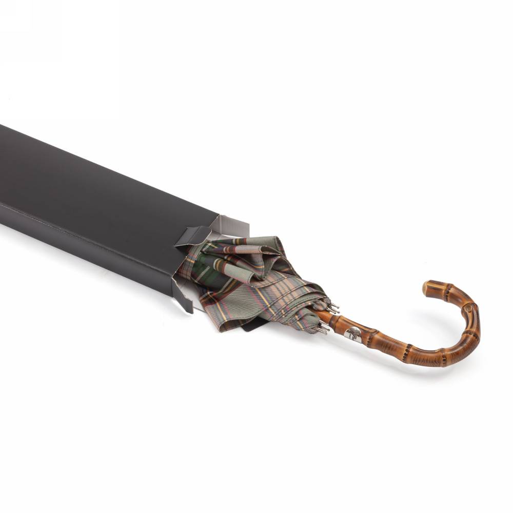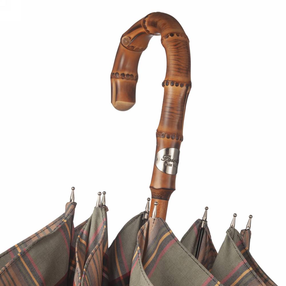 Классической мужской зонт-трость Pasotti на металлическом каркасе. Купол выполнен из плотной ткани с традиционным орнаментом "тартан", в состав которой входят хлопок и полиэстер. Стержень и рукоять двухсоставные, выполнены из древесины клёна и бамбука с характерными природными узорами. Модель дополнена металлическим наконечником, защищающим стержень от сколов при соприкосновении с асфальтом. На рукояти закреплён металлический шильд с выгравированным логотипом компании.